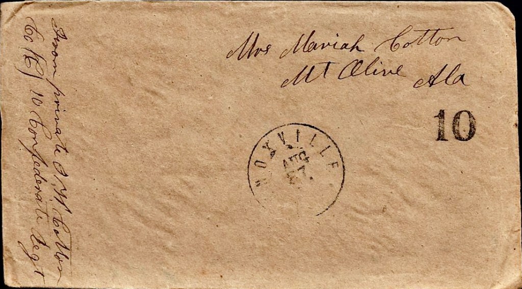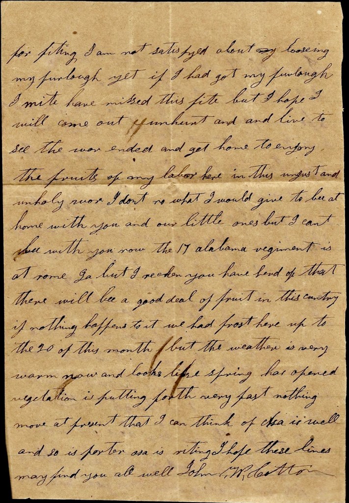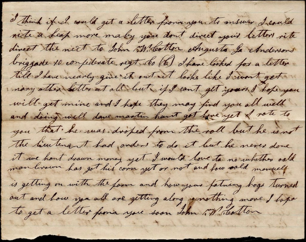 Mr. Brown is writing and Asa will send a few lines with me. I hant got but little to write but I think if I would get a letter from you to answer, I could write a heap more. Maybe you don’t know how to direct your letters right. Direct the next to John W. Cotton, Augusta, Georgia, Anderson’s Brigade, 10th Confederate Regiment, Co. C. I have looked for a letter till I have nearly give it out. It looks like I won’t get nary other letter at all but if I can’t get yours, I hope you will get mine and I hope they may find you all well and doing well.