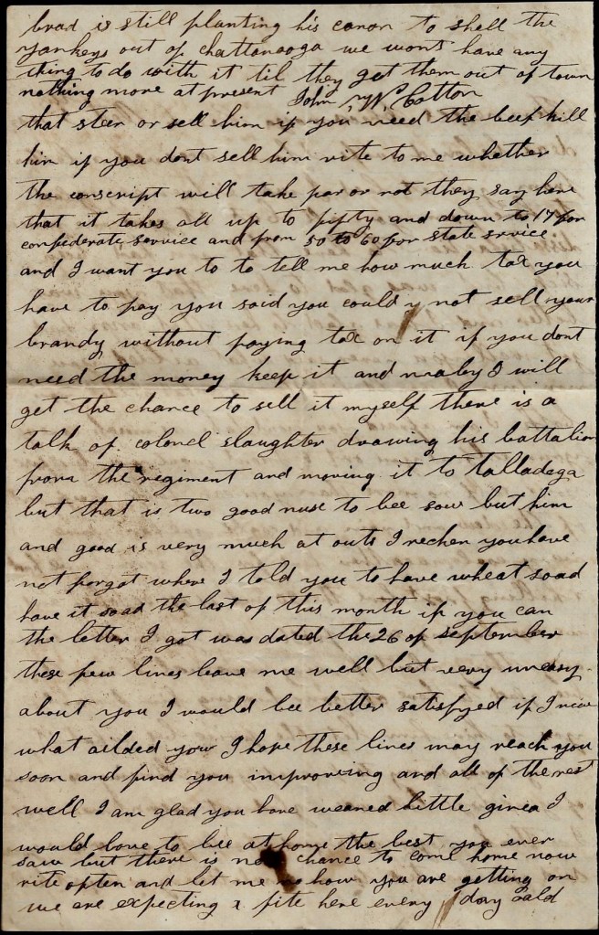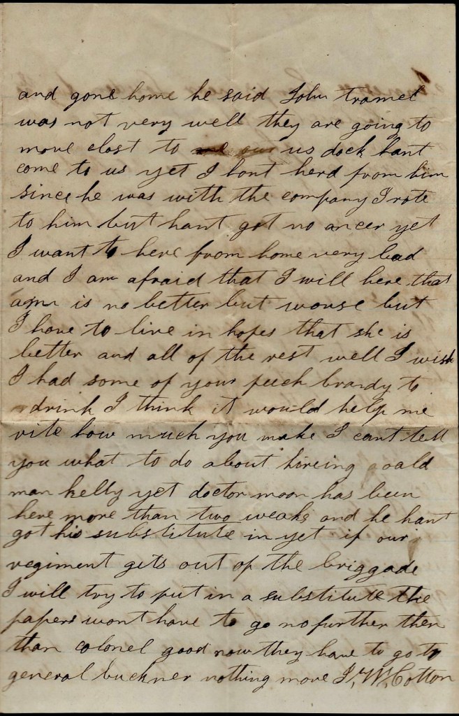 I wish I had some of your peach brandy to drink. I think it would help me. Write how much you make. I can’t tell you what to do about hiring old man Kelly yet. Doctor Moon has been here more than two weeks and he hant got his substitute in yet. If our regiment gets out of the Brigade, I will try to put in a substitute. The papers won’t have to go no further than Col. Goode. Now they have to go to General Buckner. Nothing more, — J. W. Cotton