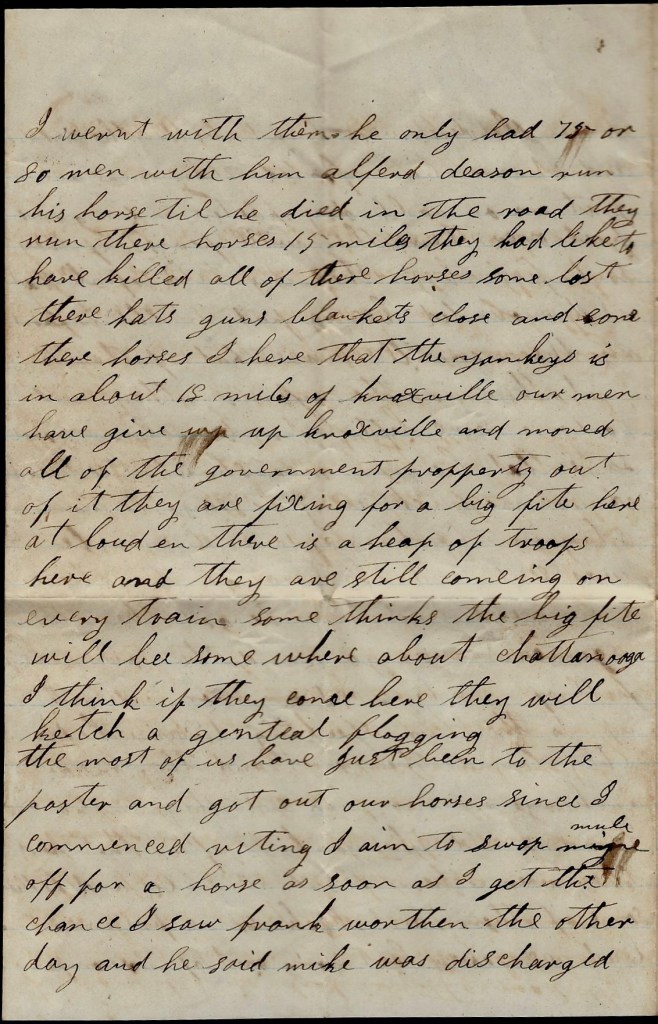There is but few of our regiment here—only those that have disabled horses and them that are afoot. All of our brigade that had serviceable horses are about 10 miles from here on Clinch River awaiting for the Yankees to come on and attack them. I have heard that they were [with]in 8 miles of Kingston. They have moved all of the sick out of Knoxville that were able to be moved and lots of the citizens are moving out of the town. Everything is in a perfect stir. But I think if the Yankeys come in here, we will whip them badly.