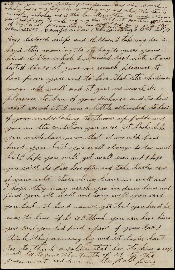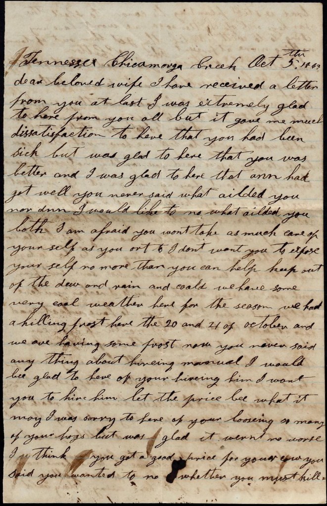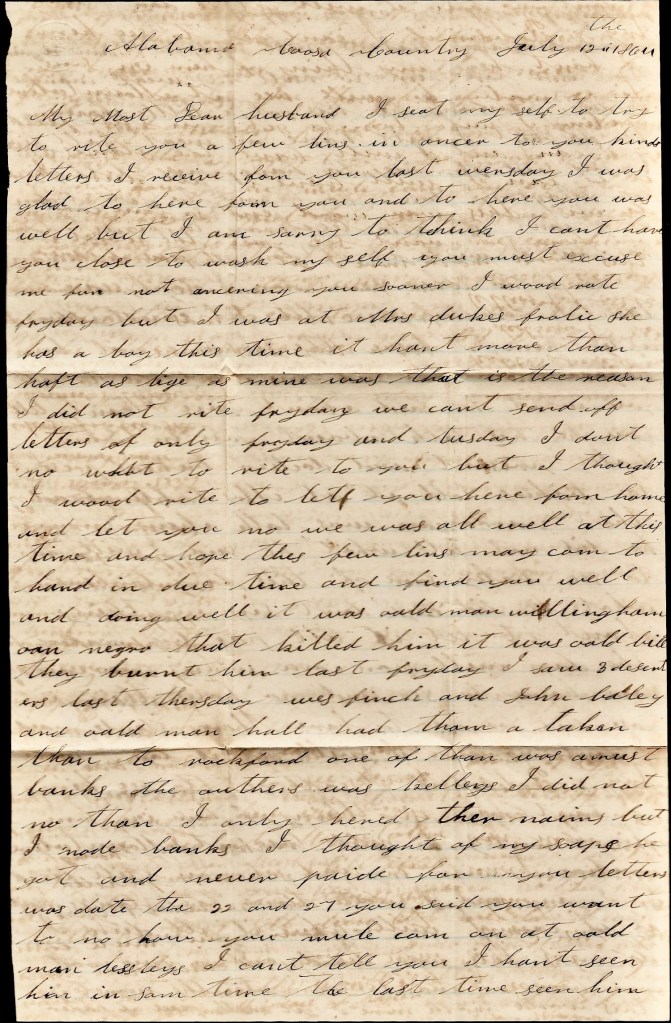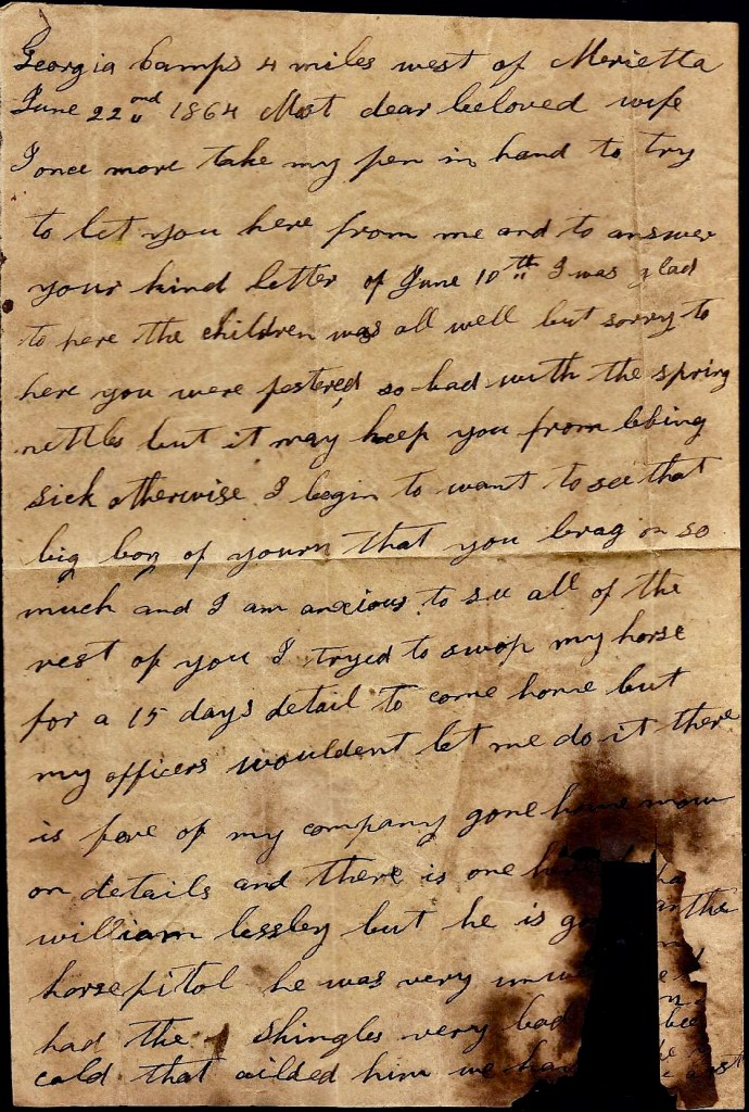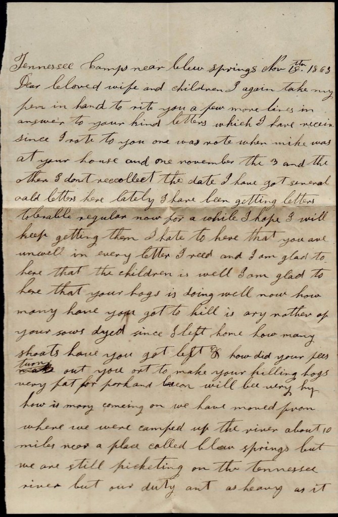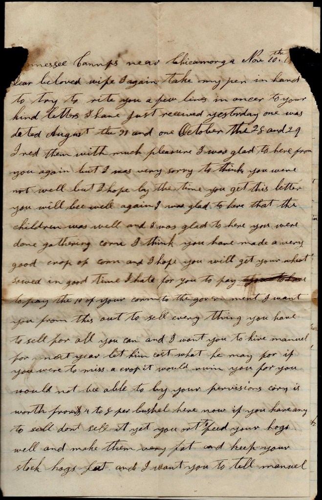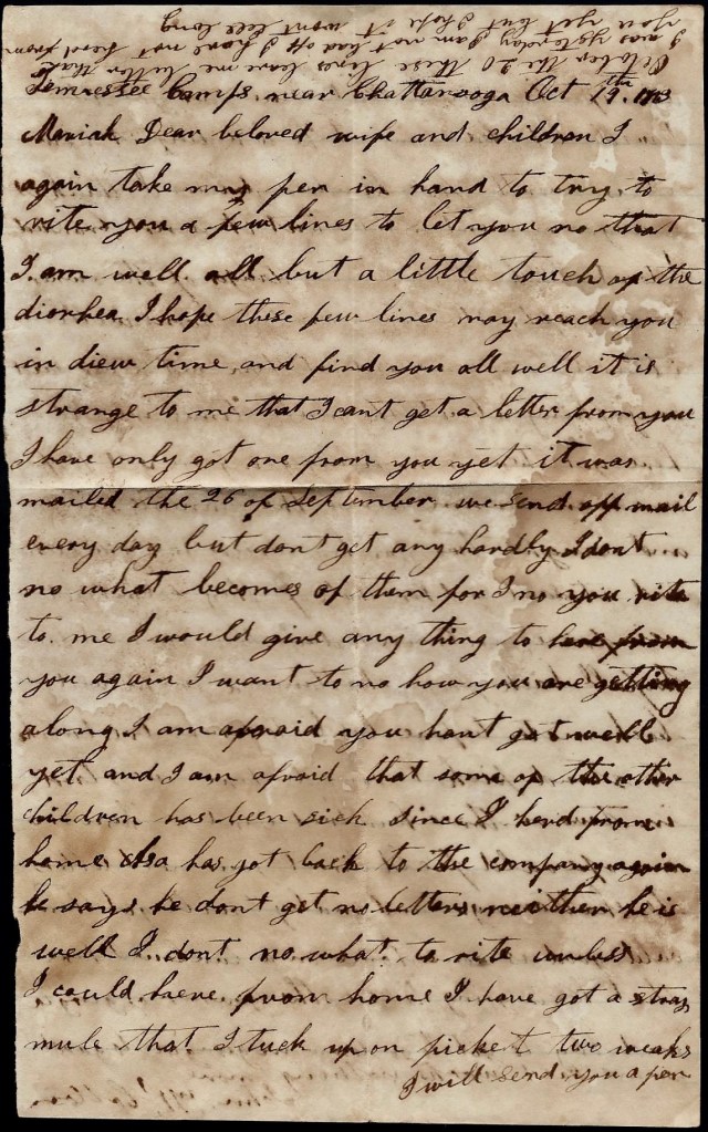 It is again I seat myself to try to write you a few lines to let you know the children is all well at this time and I hope these few lines may find you well and doing well. I hant much of importance to write to you but I thought I would write for I expect it will be some satisfaction to you to hear from home if it was only to hear we was well. I wish I could hear from you every day. I wish I knowed where you was today and that you was well but I don’t know where you are nor what you are doing. You may [be] in a battle now while I am writing this letter. If I knowed when you was in a battle, I don’t think I could sit still to write nor do anything else but I hope the Lord will be on your side and guide you safe through all your trouble and enable you to reach home safe one time more. I hope that happy day will soon come when you can come to see me and your little children.