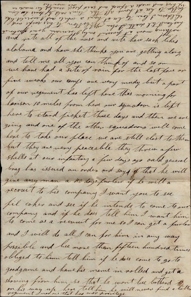 It is again that I take my pen in hand to write you a few more lines to let you know that I am well and hope these few lines may find you all enjoying the same blessing. You must excuse me for not writing no sooner. I would have wrote when Nancy left here but I thought she could tell you more than I could write and I hant wrote since for our officers has been trying to get some of us off home on a detail but they hant got us off yet for that is all of the chance for our regiment to mount themselves. That is what the detail is for. If it is made, I will be one of the men that will come home for my horse is no count and horses is very high here and I reckon not very cheap at home.