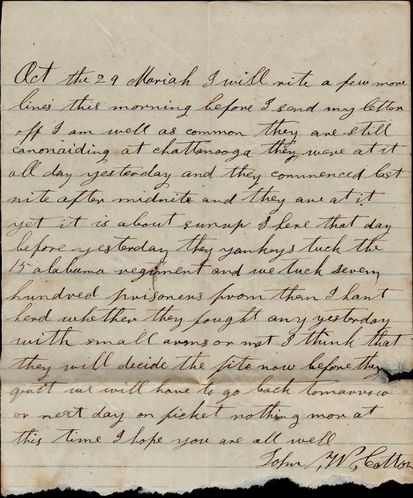 I would give a heap if I could get a letter right straight from home. I don’t know where to tell you to direct your letters to but you may write to Charleston, Tennessee. If we fall back, they will be sent back to us. I may get a letter if I ever get to see the captain. I shall be uneasy about Ann till I hear she is well. Nothing more at present. I remain your true, devoted husband till death, — John W. Cotton