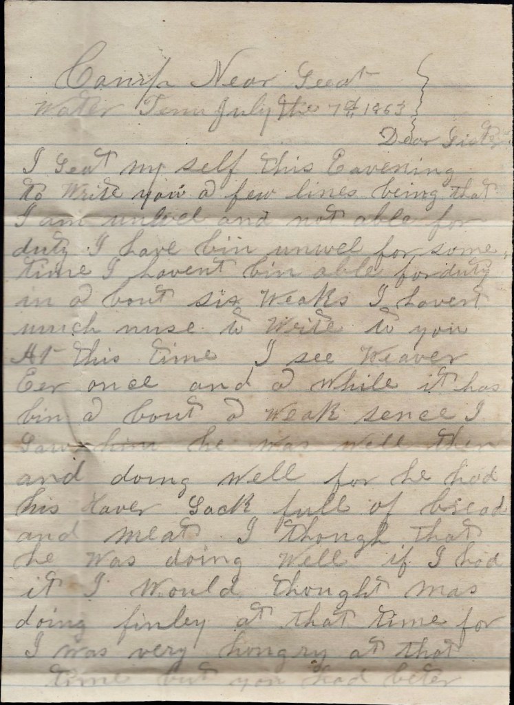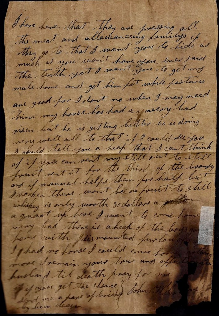 I see [your husband] Weaver ever once in awhile. It has been about a week since I saw him. He was well then and doing well for he had his haversack full of bread and meat. I thought that he was doing well. If I had it, I would thought was doing finely at that time for I was very hungry at that time. But you had better know that I walked into Weaver’s bread. We all saw very hard times when we was up in Kentucky. We are now at this time faring tolerable well. We are getting tolerable portions for ourselves and horses to eat. It has been some time since we got as much as we are getting now.
