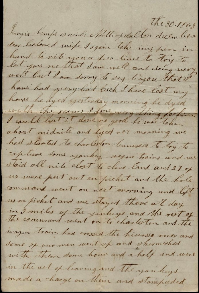 There is a talk of all that is dismounted being put in the infantry. The men all swear that if they do put them in the infantry, they will go home. Some left last night. Colonl Goode says that his men shan’t be treated in no such way. He says he won’t stay in the Brogade no longer. He was sent to Jacksboro to relieve a regiment and when he got there, the regiment was gone and the town was full of Yankeys and our men rode right up to them [with]on speaking distance before they found them out and they made a charge on our men and they broke to run and the Yankeys after them and they run them about 10 miles and killed some of them and took some prisoners but we never lost nary [one] out of our company. I went with them. He only had 75 or 80 men with him. Alfred Deason run his horse till he died i the road, They run their horses 15 miles. They had like to have killed all of their horses. Some lost their hats, guns, blankets, clothes and some their horses.