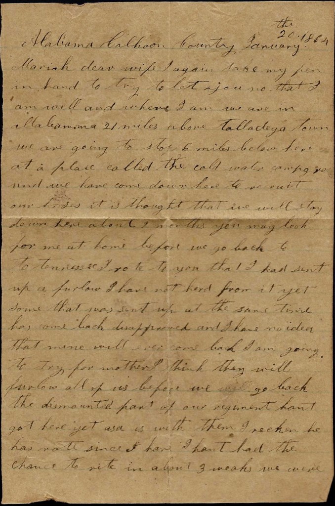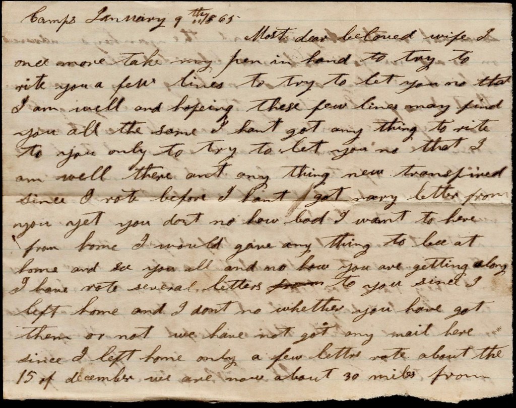 I once more take my pen in hand to try to write you a few lines to try to let you know that I am well and hoping these few lines may find you all the same. I hant got anything to write to you—only to try to let you know that I am well. There ain’t anything new transpired since I wrote before. I hant got nary letter from you yet. You don’t know how bad I want to hear from home. I would give anything to be at home and see you all and know how you are getting along. I have wrote several letters to you since I left home and I don’t know whether you have got them or not. We have not got any mail here since I left home—only a few letters wrote about the 15th of December.