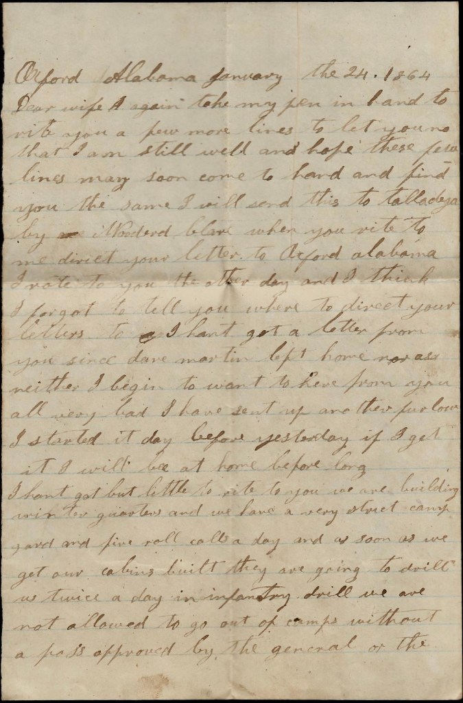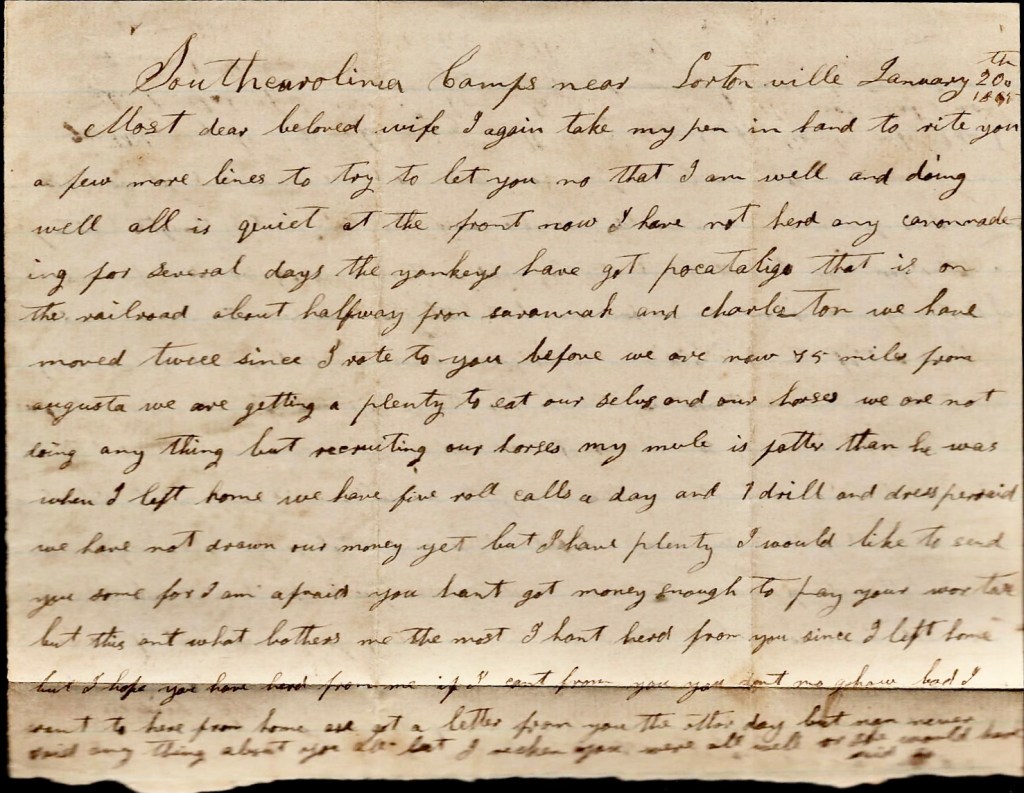 We have moved twice since I wrote to you before. We are now 75 miles from Augusta. We are getting a plenty to eat ourselves and our horses. We are not doing anything but recruiting our horses. My mule is fatter than he was when I left home. We have five roll calls a day and 1 drill and dress parade. We have not drawn our money yet but I have plenty. I would like to send you some for I am afraid you hant got money enough to pay your war tax but this ain’t what bothers me the most. I hant heard from you since I left home but I hope you have heard from me [even] if I can’t from you. You don’t know how bad I want to hear from home. Asa got a letter from home the other day but Nan never said anything about you but I reckon you were all well or she would have said. Mr Brown has got two letters from home and I don’t see why I don’t get none from you. I know you must write. I would have wrote sooner this time but I thought I might get a letter from you. I will start this by hand as there is no regular mail from here.