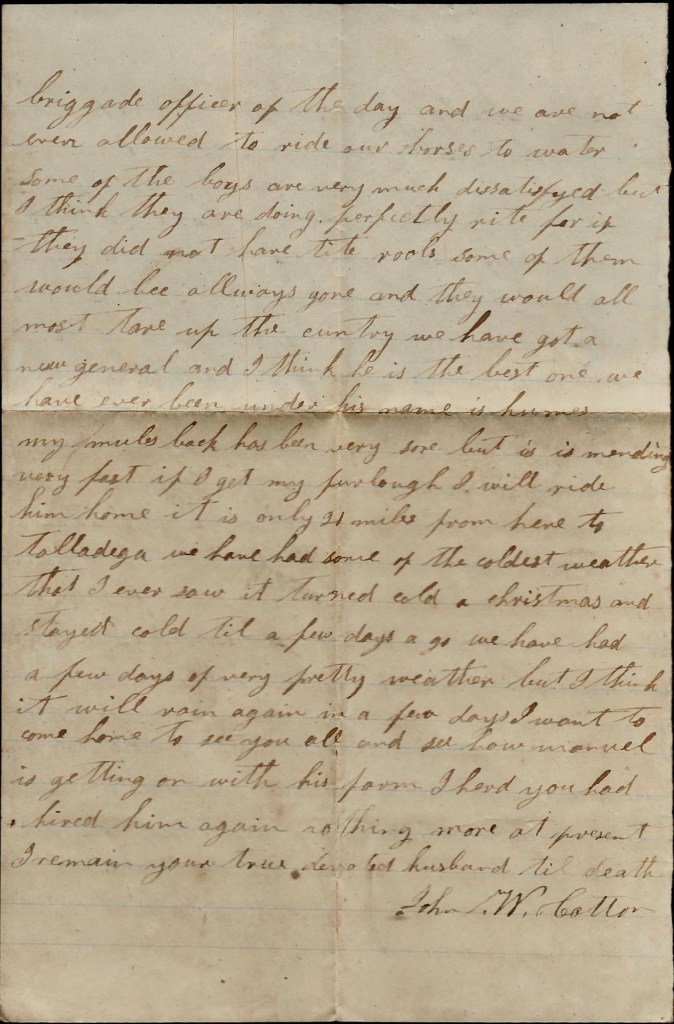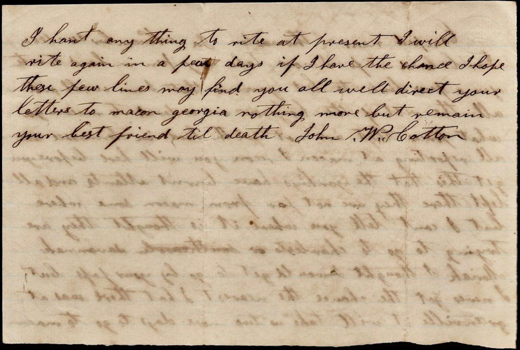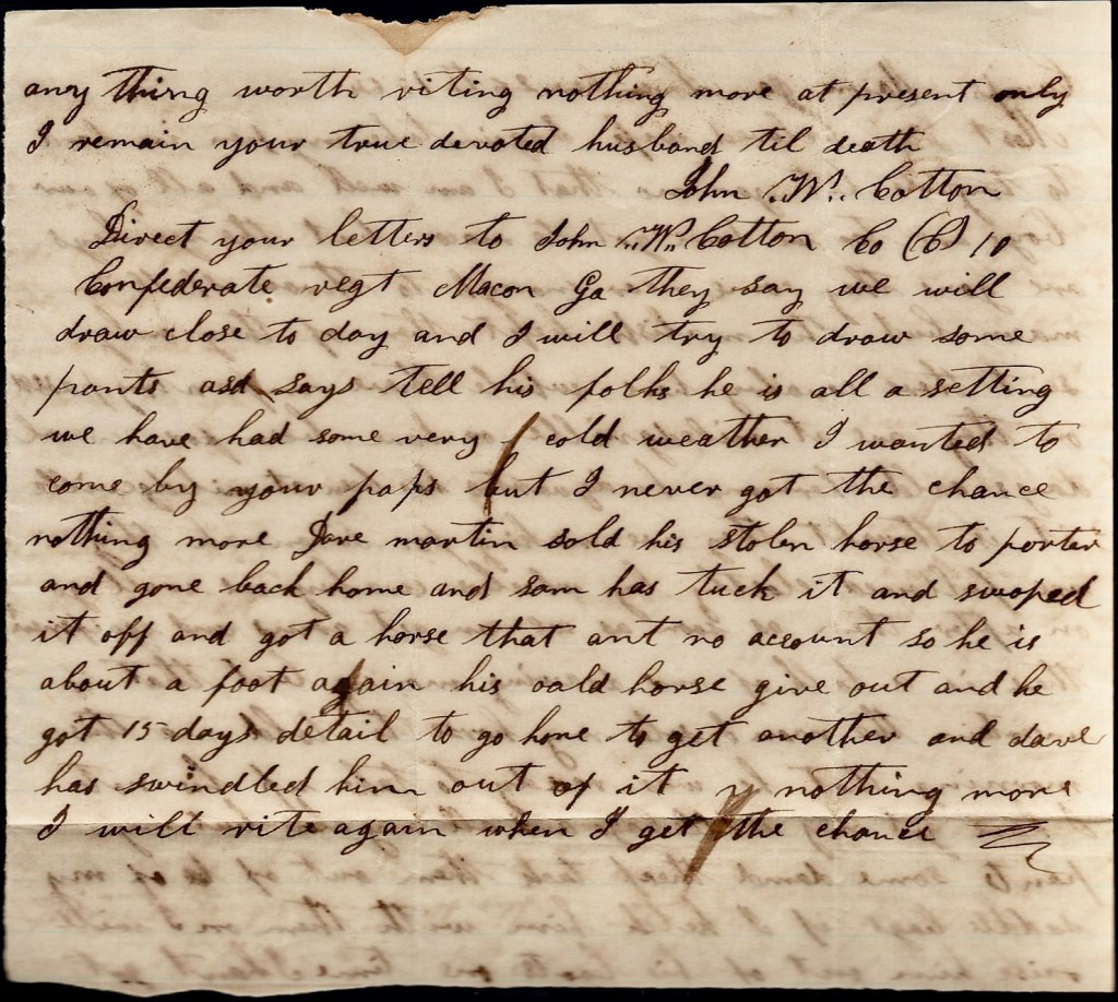 Direct your letter to John W. Cotton, Co. C, 10th Confederate Regt., Macon, Georgia. They say we will draw clothes today and I will try to draw some pants. Asa says tell his folks he is all setting. We have had some very cold weather. I wanted to come by your Pap’s but I never got the chance. Nothing more. Dave Martin sold his stolen horse to Porter and gone back home and Sam has took it and swapped it off and got a horse that ain’t no account so he is about afoot again. His old horse give out and he got 15 days detail to go home to get another and Dave has swindled him out of it. Nothing more. I will write again when I get the chance.