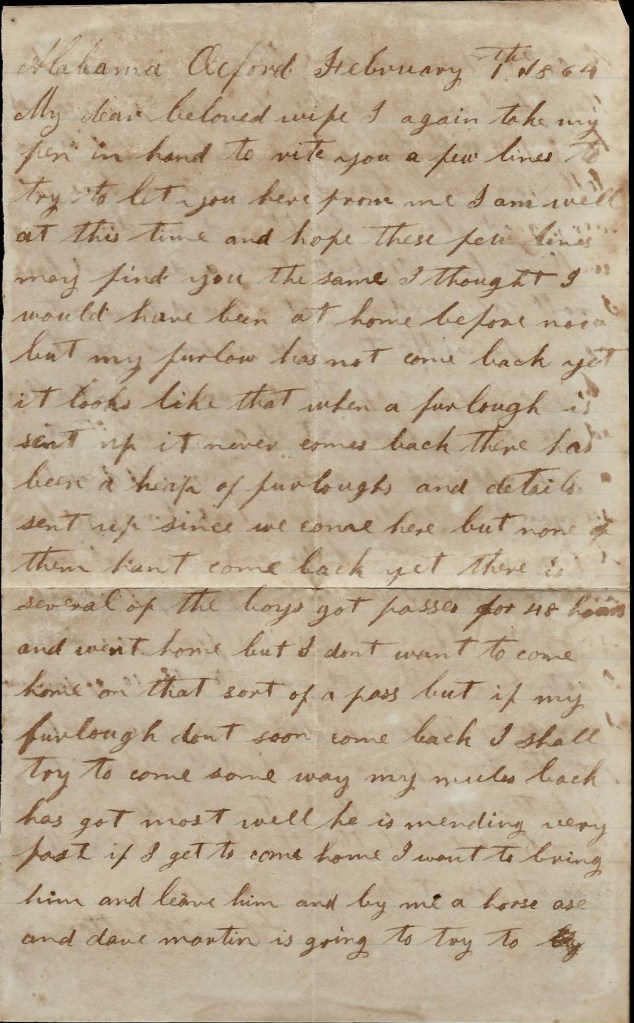 I again take my pen in hand to write you a few more lines to try to let you know that I am well and all of our boys. Asa and Billy Brown is both writing. We will send these letters by one of the regiment. I hope these few lines may find you all well and enjoying yourselves as well as posssible. I hant got but little to write to you. There is a right smart of the regiment getting furloughs but I don’t see any chance for me to get nary one. I don’t know what to write without I could get a letter from you. I hant got nary one yet. There was four come to our company last night but nary one from our settlement.