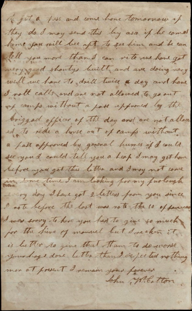 There is talk of our drawing money but that is uncertain. The man I sold my horse to told me this morning that he was ready to take up his note. I have got my saddlebags and all of my clothes but my pants. Some damned thief took them out of my saddlebags. If I catch him with them on, I will raise him out of his boots one time. I hant got anything worth writing more at present—only I remain your true, devoted husband till death. — John W. Cotton