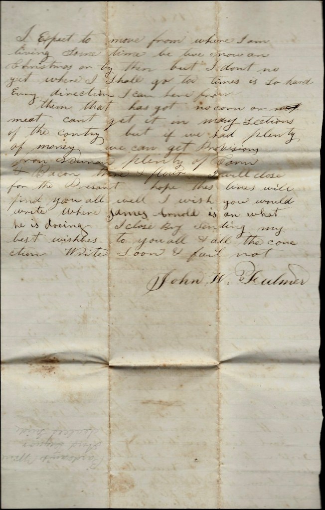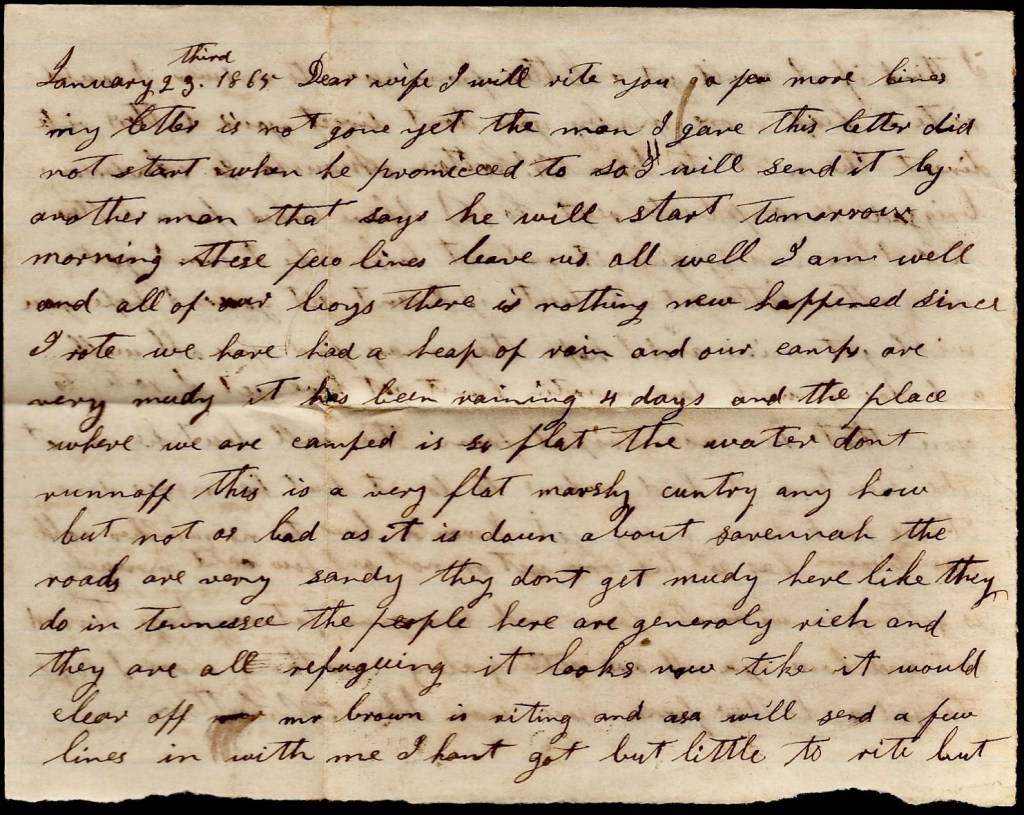 I will write you a few more lines. My letter is not gone yet. The man I gave this letter [to] did not start when he promised to so I will send it by another man that says he’ll start tomorrow morning. These few lines leave us all well. I am well and all of our boys. There is nothing new happened since I wrote. We have had a heap of rain and our camps are very muddy. It has been raining 4 days and the place where we camped is so flat the water don’t runoff. This is a very flat, marshy country anyhow but not as bad as it is down about Savannah. The roads are very sandy. They don’t get muddy here like they do inn Tennessee. The people here are generally rich and they are all refugeeing. It looks now like it would clear off.