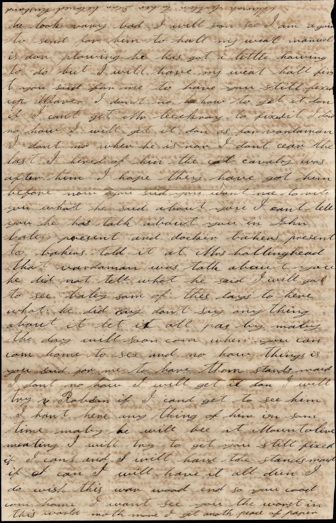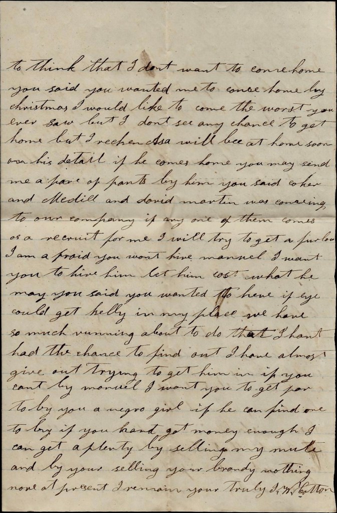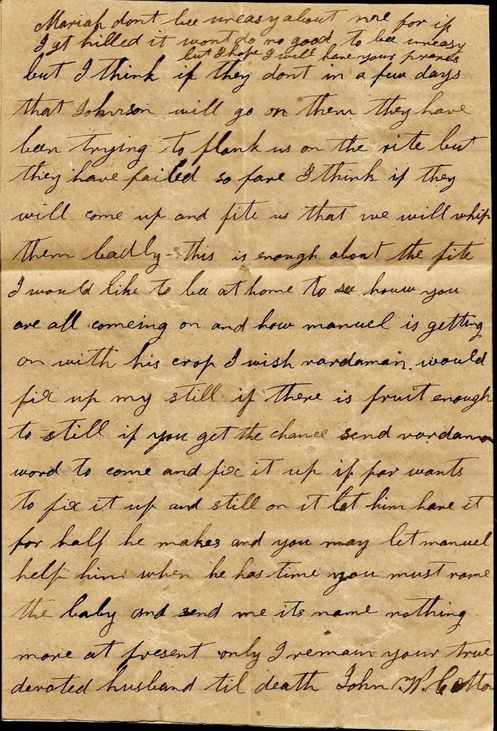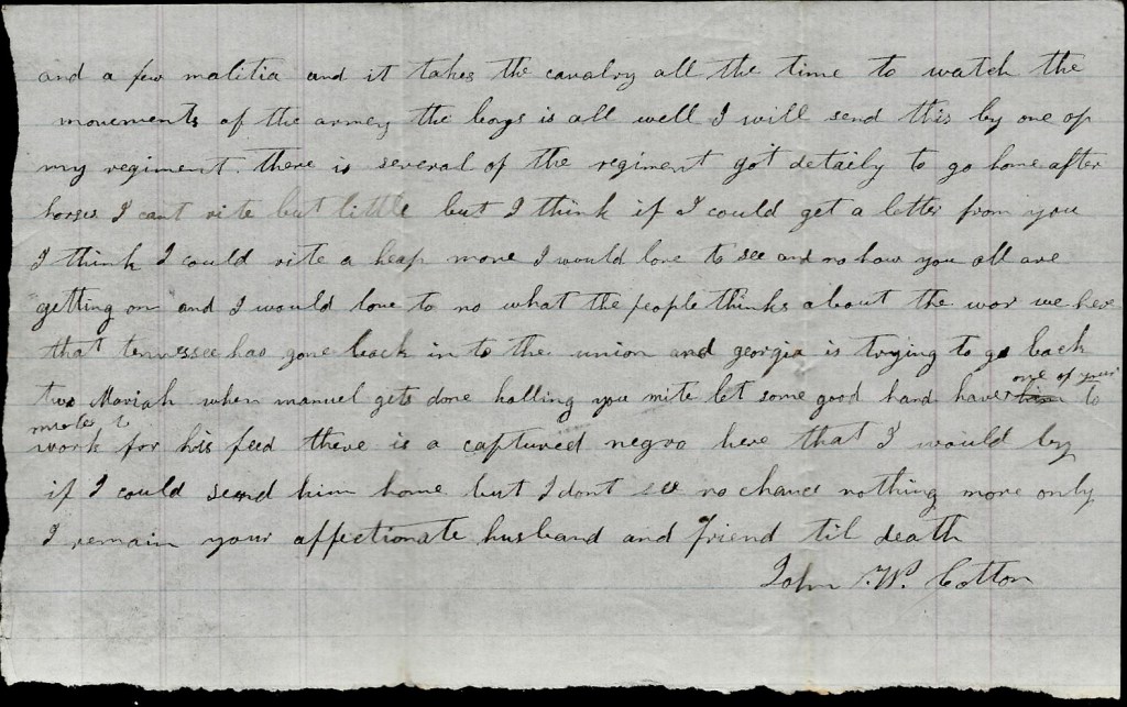 Mariah, when Manuel gets done hauling you might let some good hand have one of your mules to work for his feed. There is a captured negro here that I would buy if I could send him home but I don’t see no chance. Nothing more. Only I remain your affectionate husband and friend till death, — John W. Cotton