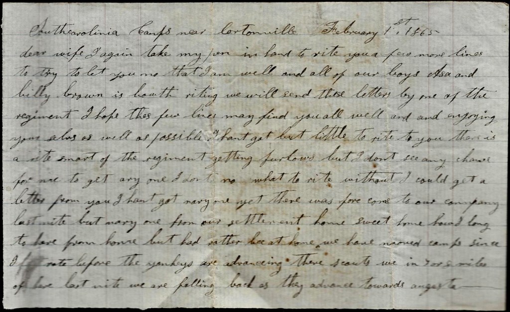I hant any news to write for we don’t hear but little here. We hear that General Hood is whipped out of Tennessee and is in Mississippi and we hear that a part of Lee’s army is at Branchville, South Carolina. Itr looks like the Yankeys has got the upper hand of us. I would like to hear of some terms of peace before they run clear over us. I think they will take Charleston without a fight. Our soldiers are very much disheartened and the most of them say we’re whipped.