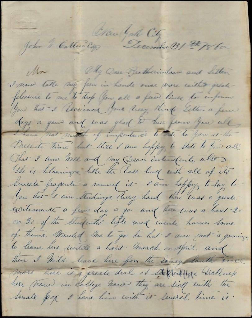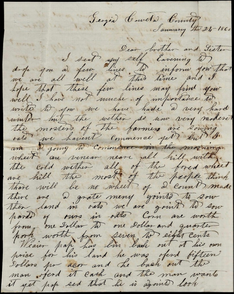 The Yankeys hant hurt anything in Savannah or reports say. They say there is a heap of the Georgia State [guards] that stayed in Savannah when we crossed the river and are now staying with the [ ] this Christmas day but we haven’t got anything to drink. It is very dull here and [ ] it is with you to drink [ ] eggnog for me as I cant get any here. I would like to be at home and help you eat sausage and pick spareribs and backbones. If you had good luck with your hogs, I would like to hear whether the cholera got among your hogs or not and how things are in general. My mule is doing very well. I am writing but I don’t know whether you will get this letter or not. I have wrote [ ] times since I left home.