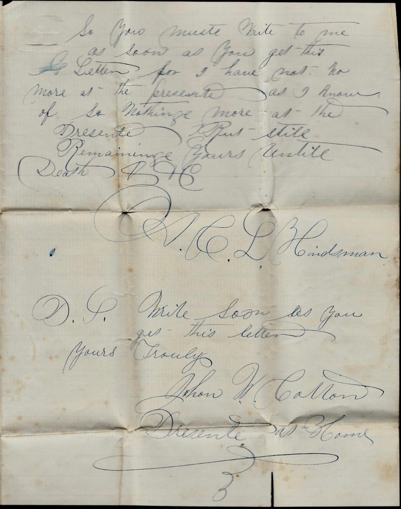 I don’t know what else to write now. I must stop writing for the man that is going home is hollering for the letters. Nothing more. Your affectionate husband till death. — John W. Cotton