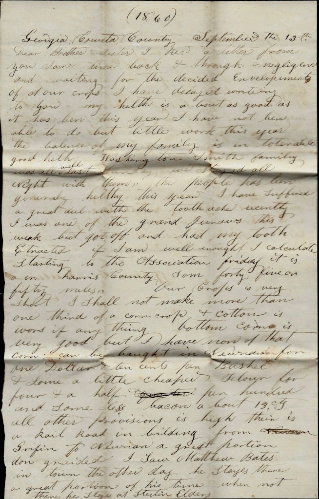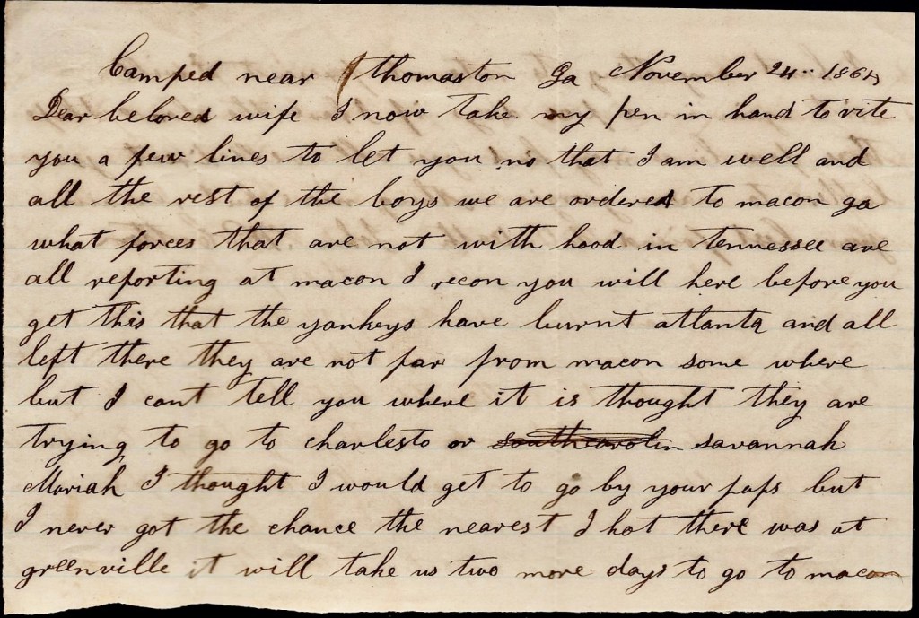 I now take my pen in hand to write you a few lines to let you know that I am well and all the rest of the boys. We are ordered to Macon, Georgia, what forces are not with Hood in Tennessee are all reporting at Macon. I reckon you will hear before you get this that the Yankeys have burnt Atlanta and all left there. They are not far from Macon somewhere but I can’t tell you where. It is though they are trying to go to Charleston or Savannah.