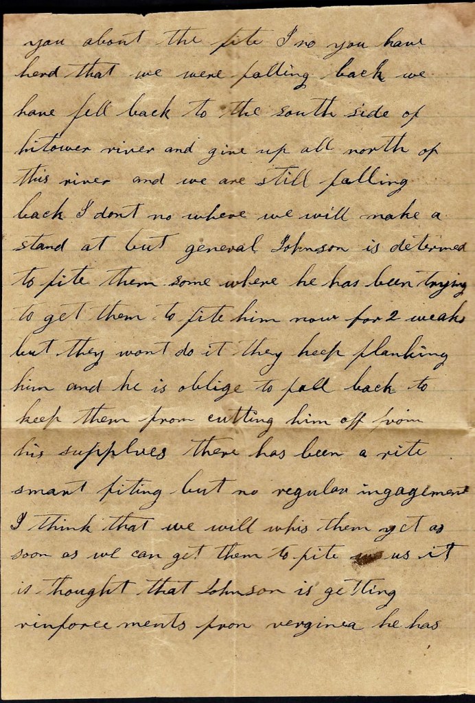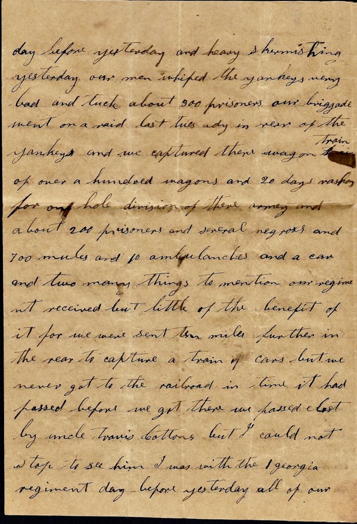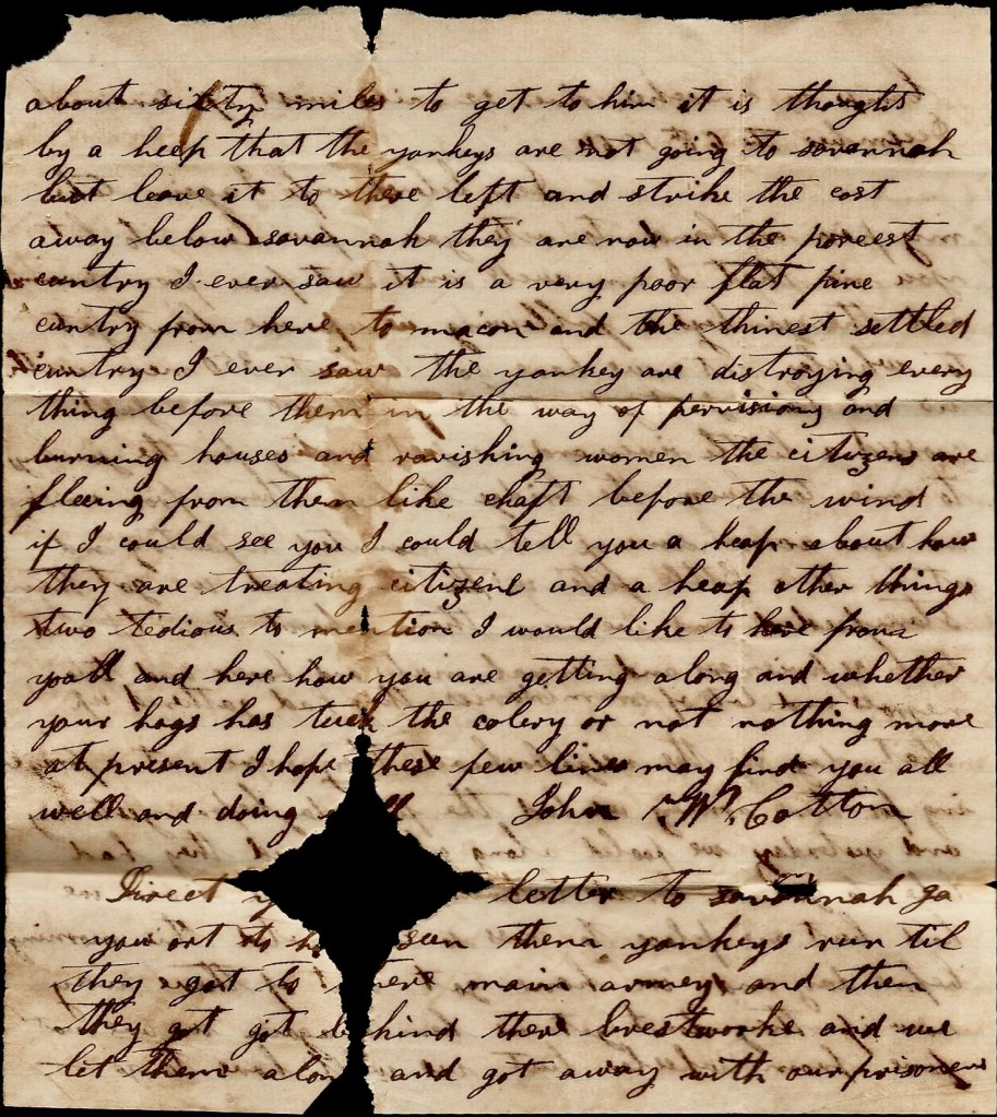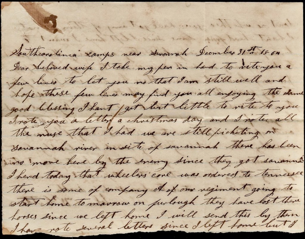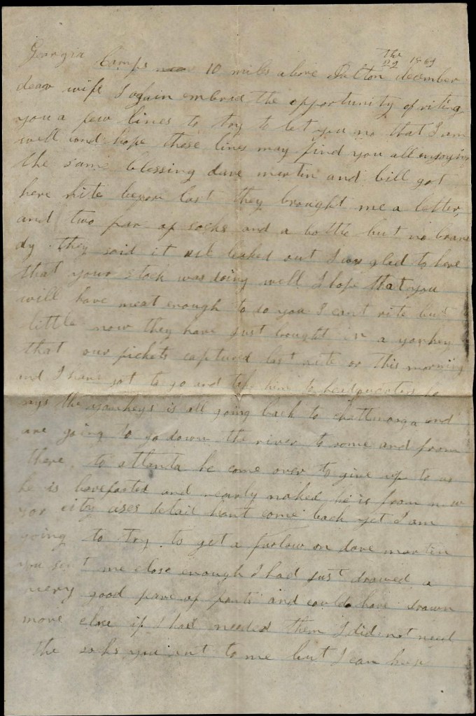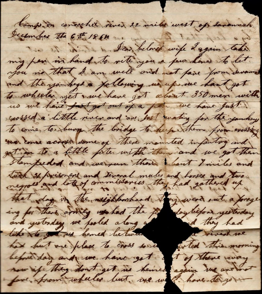 I again take my pen in hand to write you a few lines to let you know that I am well and not far from Savannah and the Yankeys a following us up. We hant got to Wheeler yet. We have got about 350 men with us. We have just got out of a fix. We have just crossed a little river and are just waiting for the Yankeys to come to burn the bridge to keep them from crossing. We come across some of their mounted infantry and got into a little fight with them and we got them stampeded and we run them about 7 miles and took 31 prisoners and several mules and horses and two negroes and lots of commissaries they had gathered up that day in the neighborhood. They were out a foraging for their army. We fooled along [ ] they had like to get us hemmed between [ ] a river. We had but one place to cross so we started this morning before day and we have got out of their way now if they don’t get us hemmed in again.