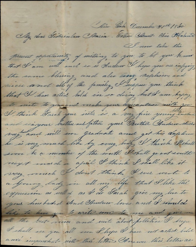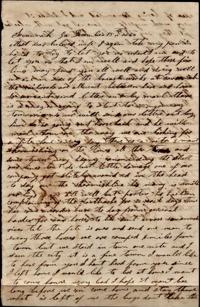 I again take my pen in hand to try to let you know where I am and to let you know that I am well and hope these few lines may find you all well and doing well. We are inside of hte breastworks at Savannah. The railroads are all cut between here and home so we can’t send letters out by mail. There is a negro going to start to Montgomery tomorrow so we will send our letters out by him. He is going out horseback and he will mail them on the way.