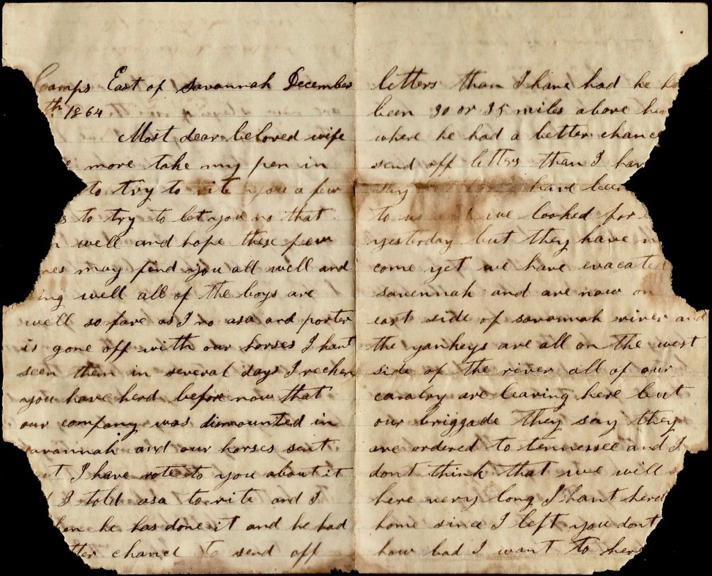 I reckon you have heard before now that our company was dismounted in Savannah and our horses sent out. I have wrote to you about it before. I told Asa to write and I then he has done it and he had a better chance to send off letters than I have had. He has been 30 or 35 miles above here where he had a better chance to send off letters than I have had.We have looked for the Yankeys to come yesterday but they have not come yet. We have evacuated Savannah and are now on the east side of Savannah river and the Yankeys are all on the west side of the river. All of our cavalry are leaving here but our brigade. They say they are ordered to Tennessee and I don’t think that we will be here very long.
