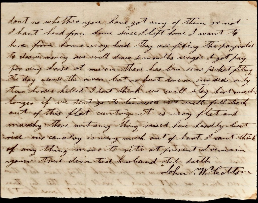 They are fixing the payrolls to draw money. We will daw 8 months wages. I got pay for my horse at Macon. There has been some picket fighting today across the river but no hurt done on our side—only two horses killed. I don’t think we will stay here much longer. If we don’t go to Tennessee we will fall back out of this flat country. It is very flat and marshy. There ain’t anything raised here hardly but rice. Our cavalry is very much out of heart.