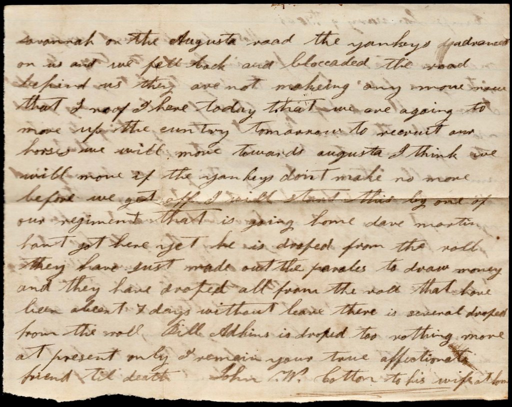 I will start this by one of our regiment that is going home. Dave Martin hant got here yet. He is dropped from the rolls. They have just made out the payrolls to draw money and they have dropped all from the rolls that have been absent 7 days without leave. There is several dropped from the rolls. Bill Adkins is dropped too. Nothing more at present—only I remain your true affectionate friend till death. — John W. Cotton
