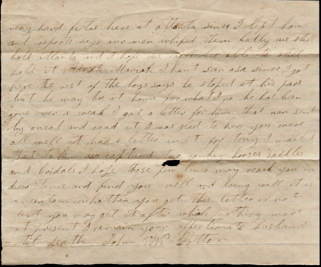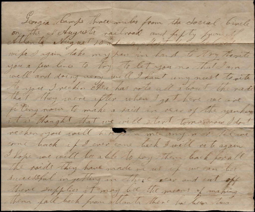 I again take my pen in hand to try to write you a few lines to try to let you know that I am well and doing very well. I hant any news to write to you. I reckon Asa has wrote all about the raid that they were after when I got here. We are fighting now to make a raid in rear of the Yankeys. It is thought that we will start tomorrow. I don’t reckon you will hear from me anymore till we come back. If I ever come back, I will write again. I hope we will be able to pay them back for all the raids they have made on us. If we can be successful in getting in their rear and cut off their supplies, it may be the means of making them fall back from Atlanta. There has been two very hard fights here at Atlanta since I left home and reports say our men whipped them badly. We still hold Atlanta and I hope we will be able to still hold it.