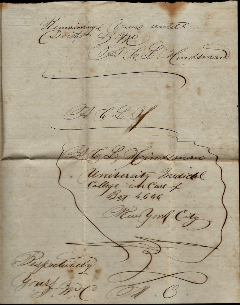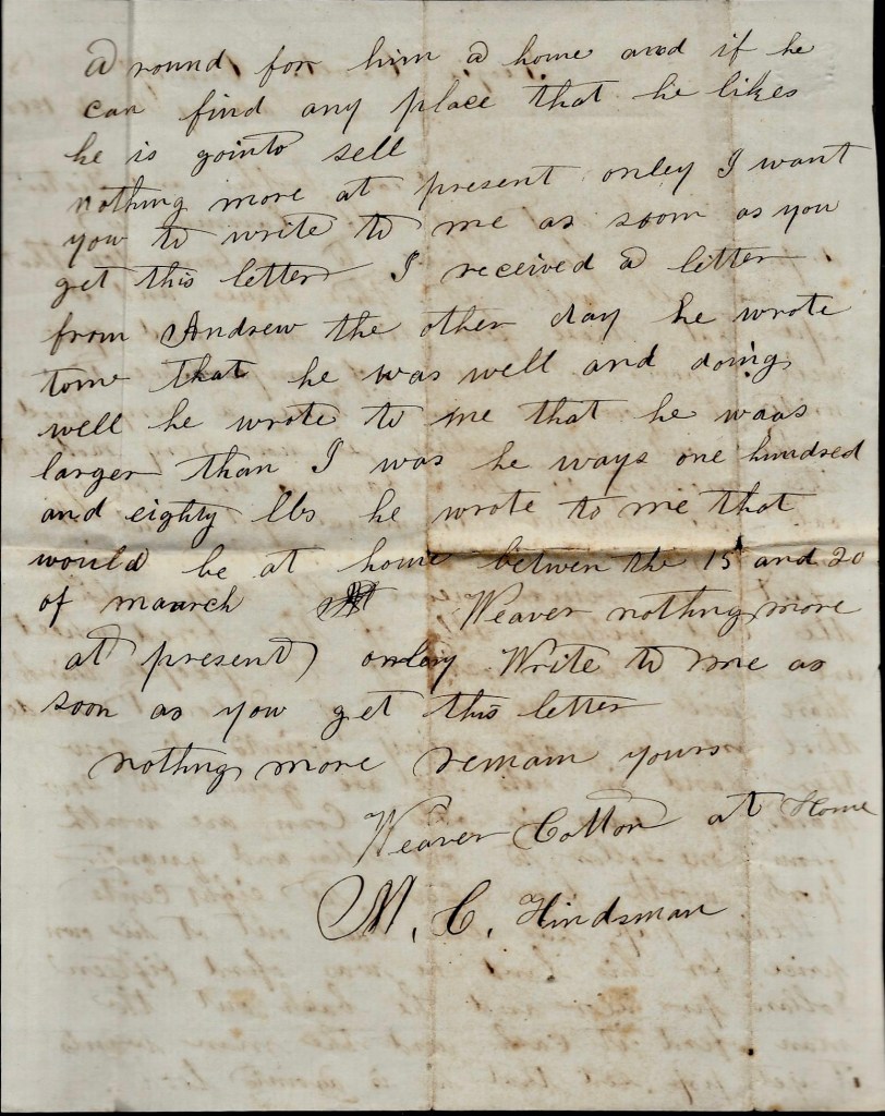 Mariah, I received a letter yesterday from Andrew and he is at home yet and he wrote that he was not well but he wrote that Pap’s family was all well. I will close for the present. Nothing more at present. Yours, &c., — M C. Hindsman