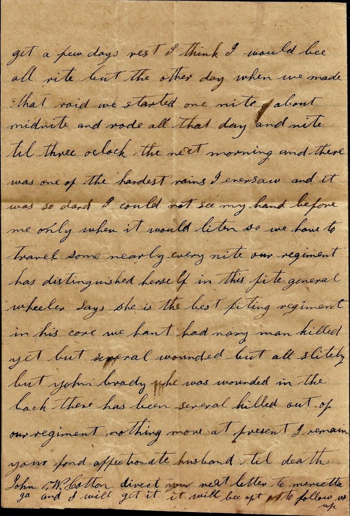 How came us here? We got behind General Wheeler and got cut off from him. There is two brigade of us and a part of another. Our men were very uneasy while we were in[side] the Yankey lines for fear we would be captured but we got out safe. We whipped the Yankeys wherever we came in contact with them. We have tore up a great deal of railroad on our route but I am afraid it hant done much good. We hear that the Yankeys has got Atlanta but I hear that our men has taken it back. It ain’t worth while to say how bad I want to see you. I hant heard a word from you since I left home and this is the third letter I have wrote to you. If I could see you, I could tell you a heap. I wil write more as soon as I get the chance.