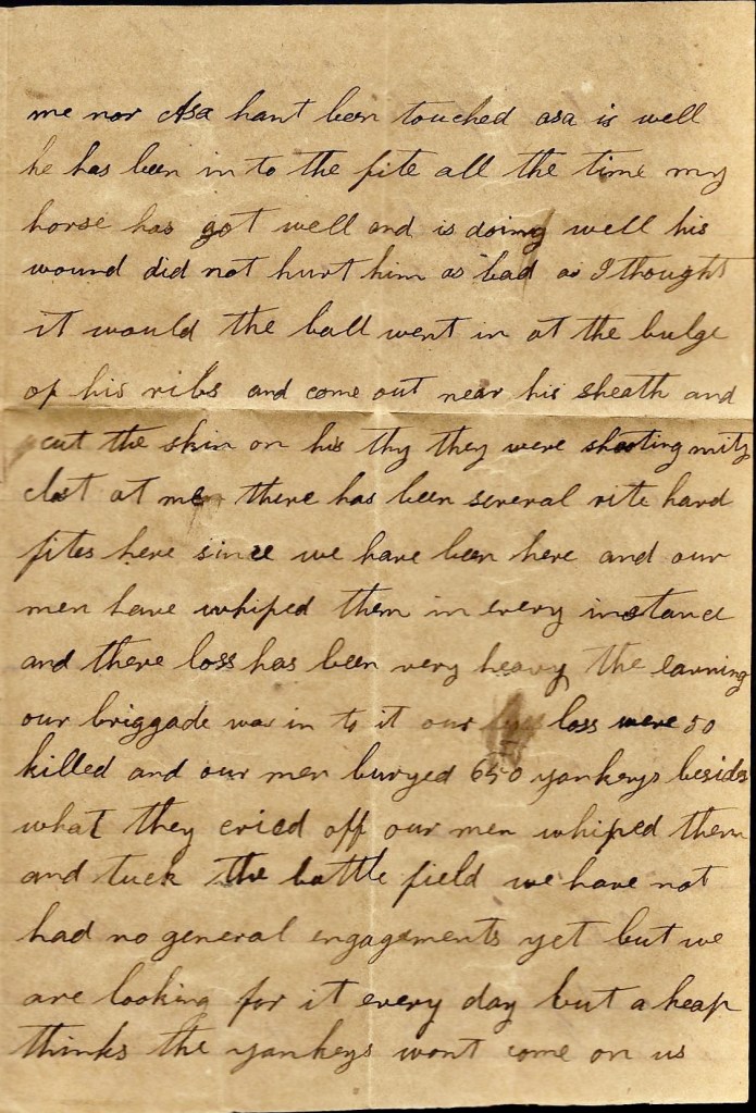 Mariah, I hant seen Asa since I got here. The rest of hte boys says he stopped at his Pars but he may be at home for what I know. He has been gone over a week. I got a letter for him that Nan sent by O’Neal and read it. I was glad to hear you were all well. It had a letter in it for Tony. I mailed that to him. Asa captured two Yankey horse’s saddles and bridles.