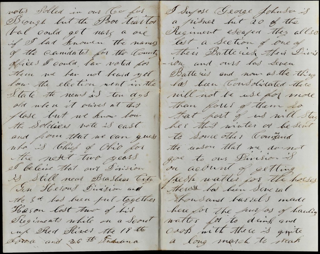 There is no news here that would be of any interest to you that you do not hear. We have had the privilege of voting on the 13th. There was 61 votes polled in our company for [John] Brough but the poor traitor Val[andigham] could get nary a one. If I had known the names of the candidates for the county offices, I could have voted for them. We have not heard how the election went in the state. The news is ten days old when it arrives at this place but we know how the soldiers vote is cast and from that we an guess who is Chief of Ohio for the next two years.