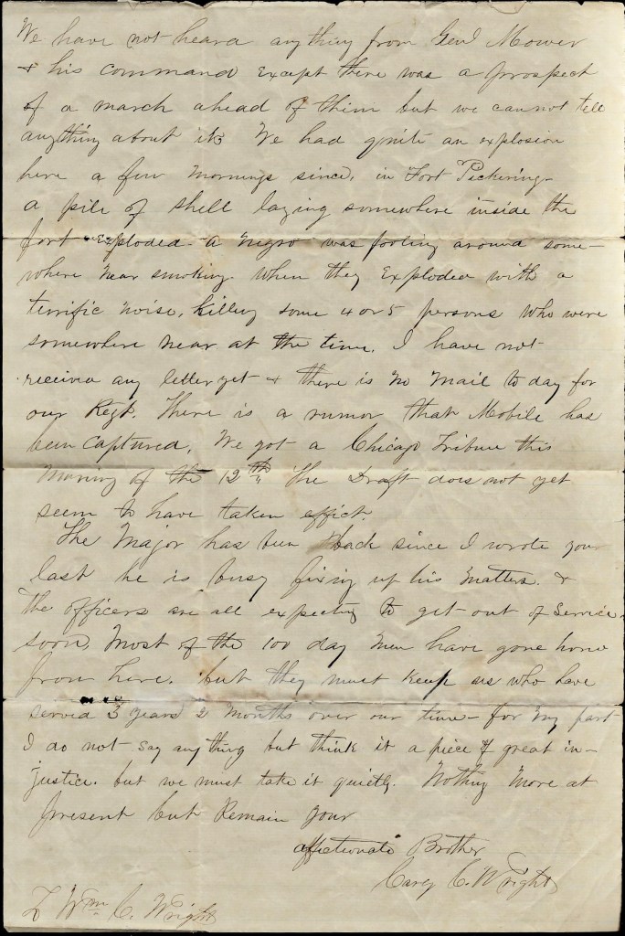 The Major has been back since I wrote you last. He is busy fixing up his matters & the officers are all expecting to get out of service soon. Most of the 100 days men have gone home from here but they must keep us who have served three years two months over our time. For my part, I do not say anything but think it is a piece of great injustice. But we must take it quietly. Nothing more at present but remain your affectionate brother, — Carey C. Wright