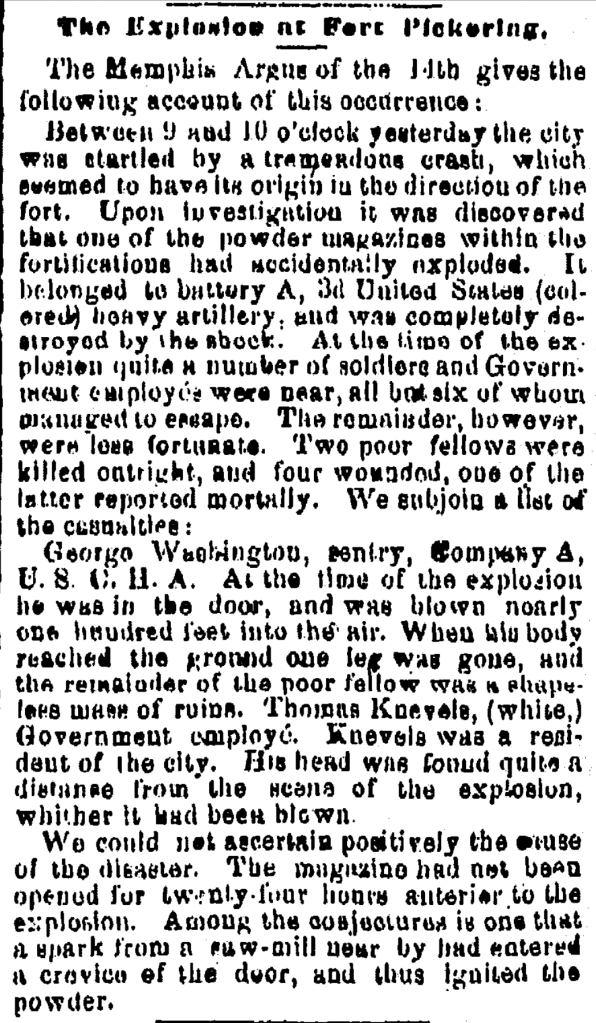 1 The New York Times reported on 18 September 1864: “About nine o’clock on Tuesday morning last, the citizens of Memphis were startled by one of the most terrific explosions ever heard there; a shell house under the banks, in Fort Pickering, containing some two hundred and fifty shells, exploded killing two men, one a negro soldier and the other an Irish laborer, and wounding several negro soldiers. One died during the day of his wounds. It was found upon examination that 110 shells had exploded. The explosion was occasioned by sparks from the steamer Neill.Actually, the cause of the accident was unknown.
