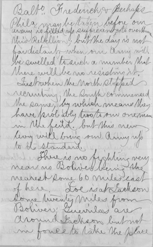 There is no fighting very near us, Bolivar being the nearest some 60 miles east of here. [Brother] Joe is at Jackson some twenty miles from Bolivar. Guerrillas are around Jackson but not in force to take the place. Matters are quiet generally on the river. The health of our camp is very good. My health still continues good, or better than ever in fact. The weather is splendid.