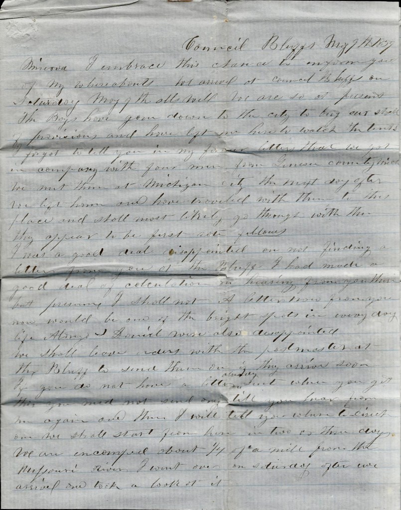 I embrace this chance to inform you of my whereabouts. We arrived at Council Bluffs on Saturday, May 7th, all well. We are so at present. The boys have gone down to the city to buy our stock of provisions and have left me here to watch the tents. I forgot to tell you in my former letters that we got in company with four men from Genesee County, Michigan. We met them at Michigan City, the next day after we left home and have traveled with them to this place and shall most likely go through with them. They appear to be first rate fellows.