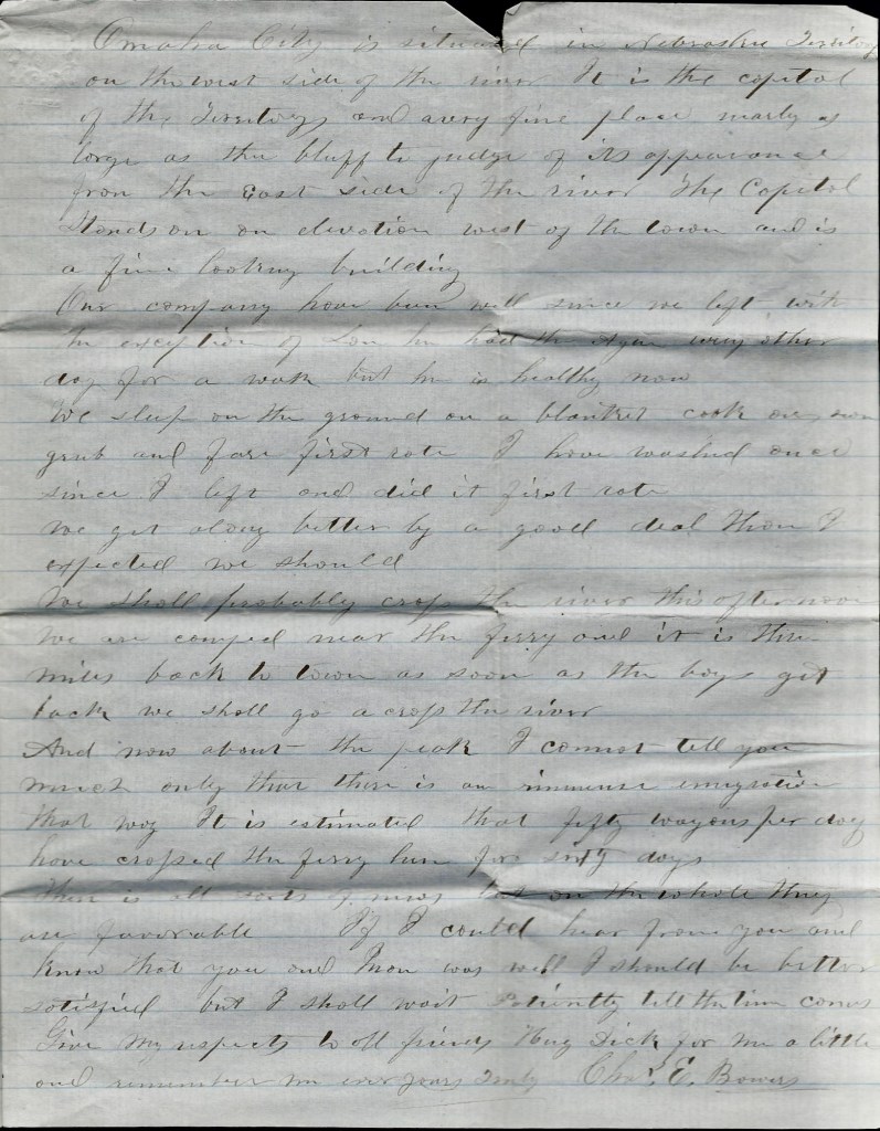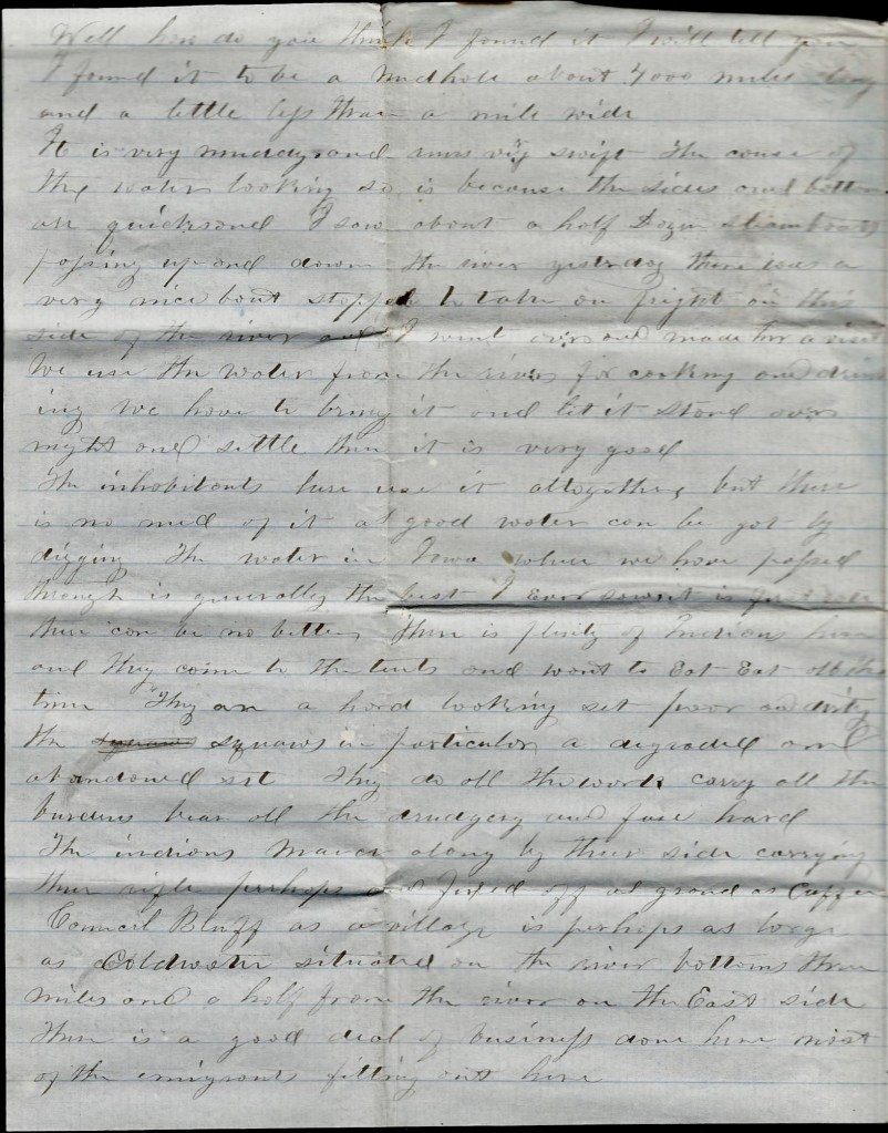 We are encamped about ¼ of a mile from the Missouri River. I went over on Saturday after we arrived and took a look at it. Well, how do you think I found it. I will tell you. I found it to be a mudhole about 4000 miles long and a little less than a mile wide. It is very muddy and runs very swift. The cause of the water looking so is because the sides and bottom are quicksand. I saw about a half dozen steamboats passing up and down the river yesterday. There was a very nice boat stopped to take on freight on this side of the river and I went over and made her a visit. We use the water from the river for cooking and drinking. We have to bring it and let it stand over night and settle, then it is very good. The inhabitants here use it altogether but there is no need of it as good water can be got by digging. The water in Iowa where we have passed though is generally the best I ever saw. It is first rate. There can be no better.