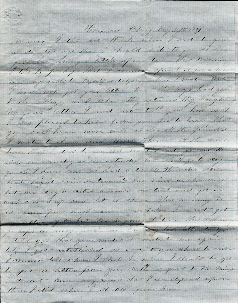 We did not go over the [Missouri] river on Monday as we intended but we shall go today, for all I know now. We had a terrible thunderstorm last night—rain in torrents and wind in abundance. But we dug a ditch around our tent and got in and covered up and let it storm. This morning it is again fair and warm. Dan and Lon have not got any letter yet, but Dan is going to town this morning, perhaps he may find one. In my last letter to you I told you that you need not write to me again till I got established or wrote to you where to write. I cannot tell when I shall be where. I should be apt to get a letter from you with regard to the mines. I do not know anymore that I can depend upon than I did when I started from home.