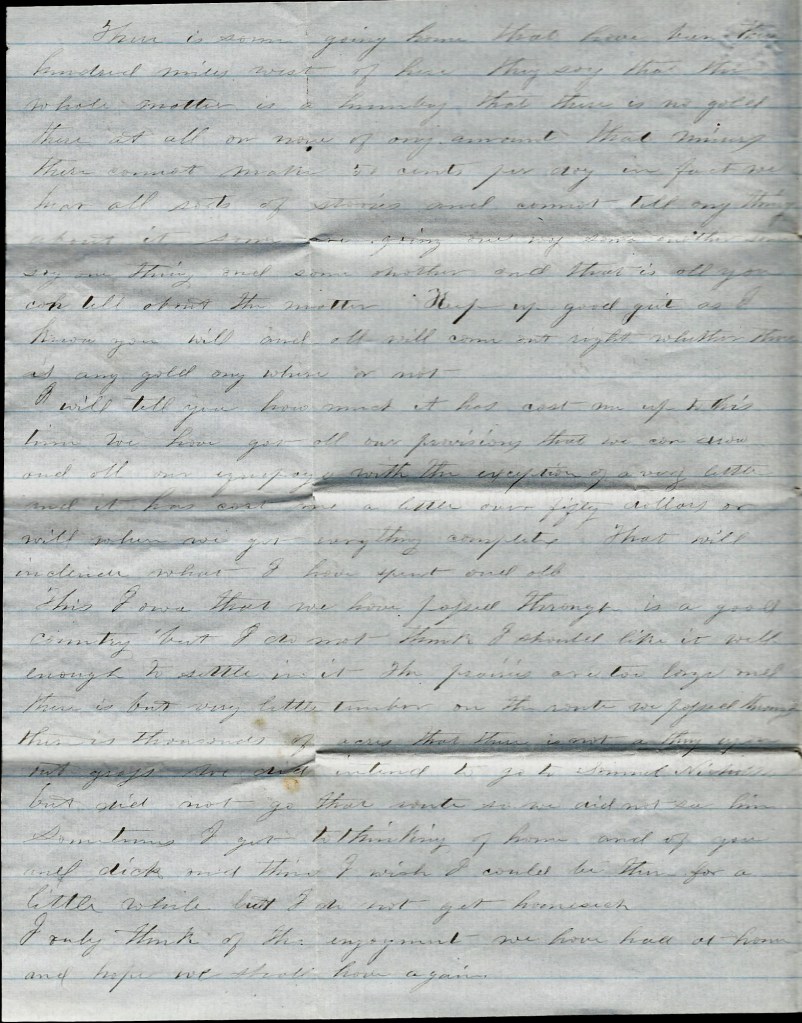 Minerva, in my last letter I told you that the news from the mines were very discouraging. They are so still and a great many men are coming back from the mines. Yes, thousands of them who say they cannot make their board by digging gold. But we are going on and if the mines at the Peak do not pay, we are going on to California. We can do just as well by going through as to come home and go just as cheap from there as to come home. You can just not say anything to anyone about our going to California till I write to you whether we are going or not. I don’t think I can afford to come so far and not make it pay. The man that come with us from ‘Homer’ leaves us here. Thinks it will not pay to go farther. Perhaps he will call and see you if he comes home but I do not know whether he will or not.
