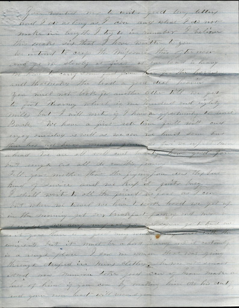 Tell your mother that the frying pan does the best kind of service and we keep it quite busy. I shall write to all the friends as fast as I can, but when we travel, we have to work hard. We get up in the morning, get our breakfast, pack up and move on. At night we camp, unpack, get our supper, go to bed and so it goes. There is a good many women going west with the emigrants, but it must be a hard journey and it certainly is a rough place. I saw one woman that was going through dressed in men’s clothes. She was not smart.