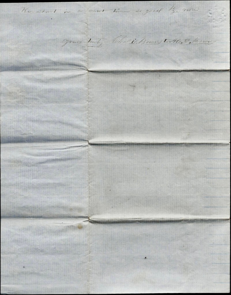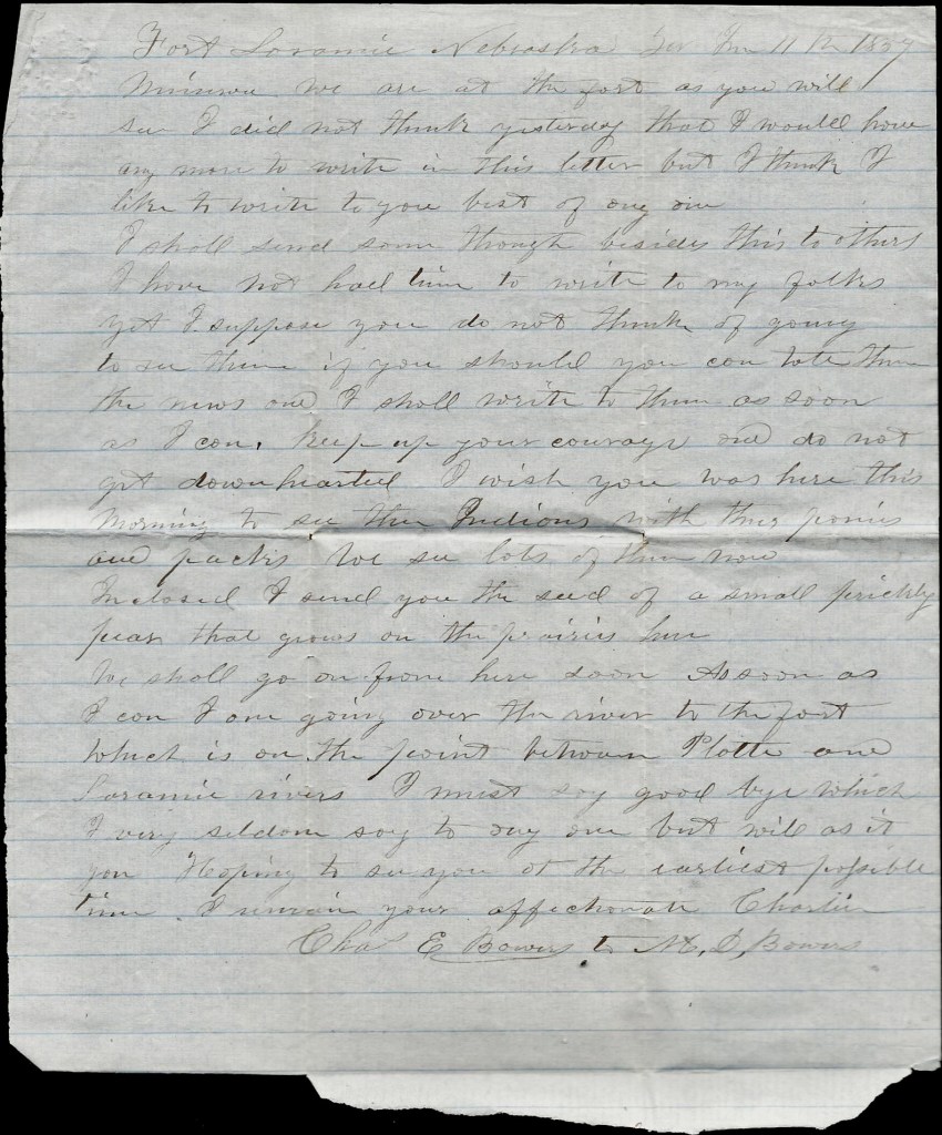 I do not know that I shall write any more this time. If I get time when we get to the fort I will. And now good-bye, — Chas. E. Bowers to M.D. Bowers