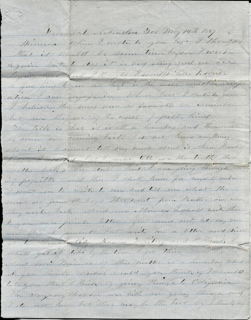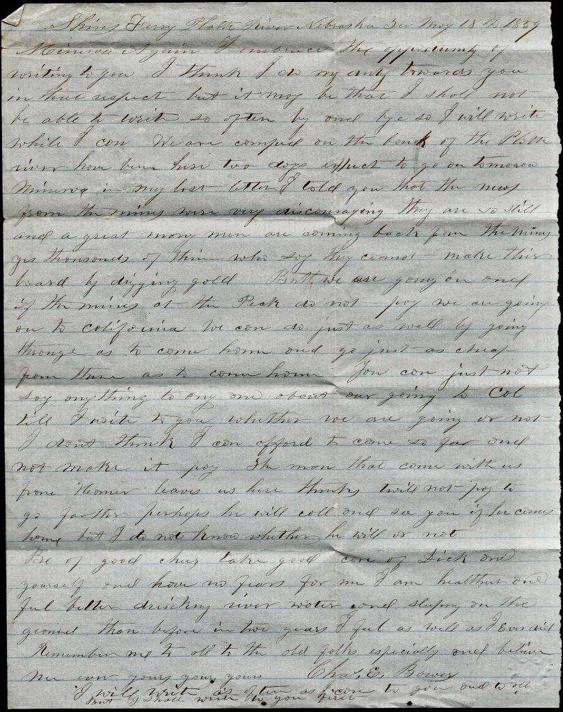 And now Minerva, if this matter is a humbug, what do you think or what would you think if I should tell you that I think of going through to California. The company that we are with are going through and I do not know but that may be the best way. I think so. When I get to Cherry Creek, I can go to California just as cheap as I can come home, and I think I would like to go. The news from the Kansas mines are very discouraging but I can’t tell you any more now till I get there and know for myself and I shall write to you as often as I can.