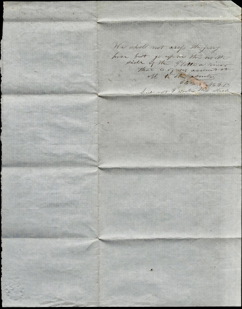 This is a splendid looking country but there is no timber and it is not near as ___ as Michigan. I went down to the Platt River this morning with Dan and took the first look at it. We are 40 miles west of the Bluffs. I cannot write much as we shall leave here this afternoon I suppose. Think the matter over and write me a letter directed as above and there I will have more chance to know. If you want any money, tell Lew so and he will get it for you. Take good care of yourself and Juan and then I shall be satisfied. I am healthy and feel first rate as far as health is concerned. Do not say anything to anyone of this matter.