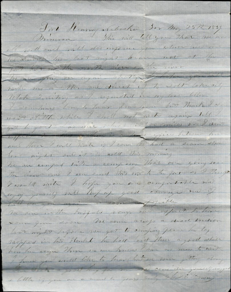 We had a snow storm last night and it is cold this morning. We are camped with a company that are going over the river and I can send this over to the fort, so I thought I would write. I hope you are comfortable and enjoy yourself well. Keep up good courage and I will see you again as soon as possible. We are in the buffalo range and expect to have some fun soon. We came across a dead Indian last night before we got to camping plane. He lay wrapped in his blanket. He had laid there a good while. How he came there, no one knows. I have no news to write. I knew you would like to hear how we were getting along.