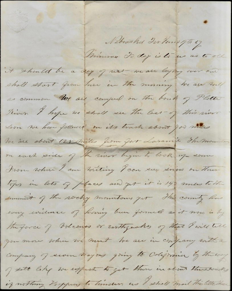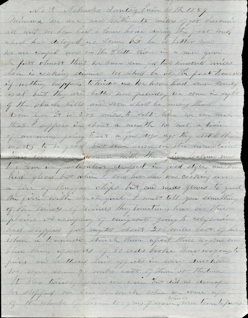 Again, I embrace the opportunity of writing to you. I think I do my only towards you in that respect but it may be that I shall not be able to write so often by and by so I will write while I can. We are camped on the bank of the Platte River. Have been here two days [and] expect to go on tomorrow.