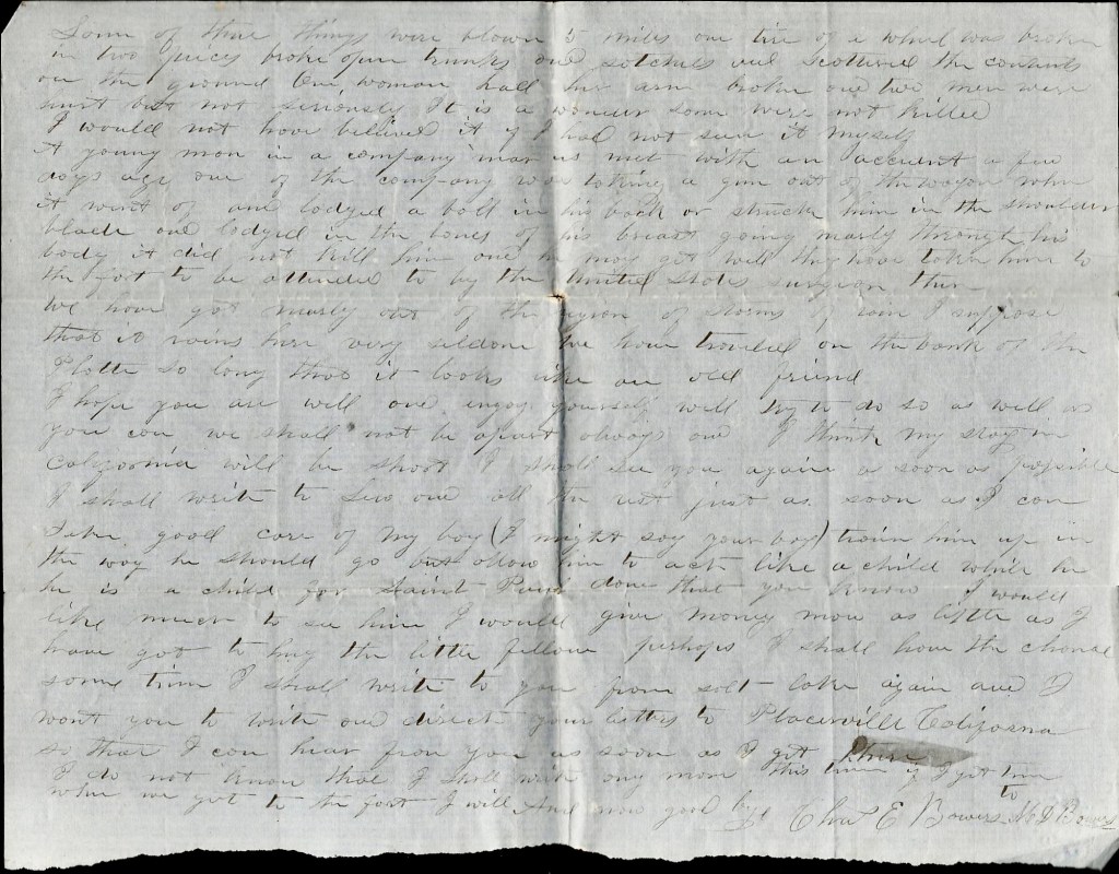 Be of good cheer. Take good care of Dick and yourself and have no fears for me. I am health us and feel better drinking river water and sleeping on the ground than before in two years. I feel as well as I ever did. Remember me to all to the old folks especially, and believe me ever yours, yours, yours, — Chas. E. Bowers