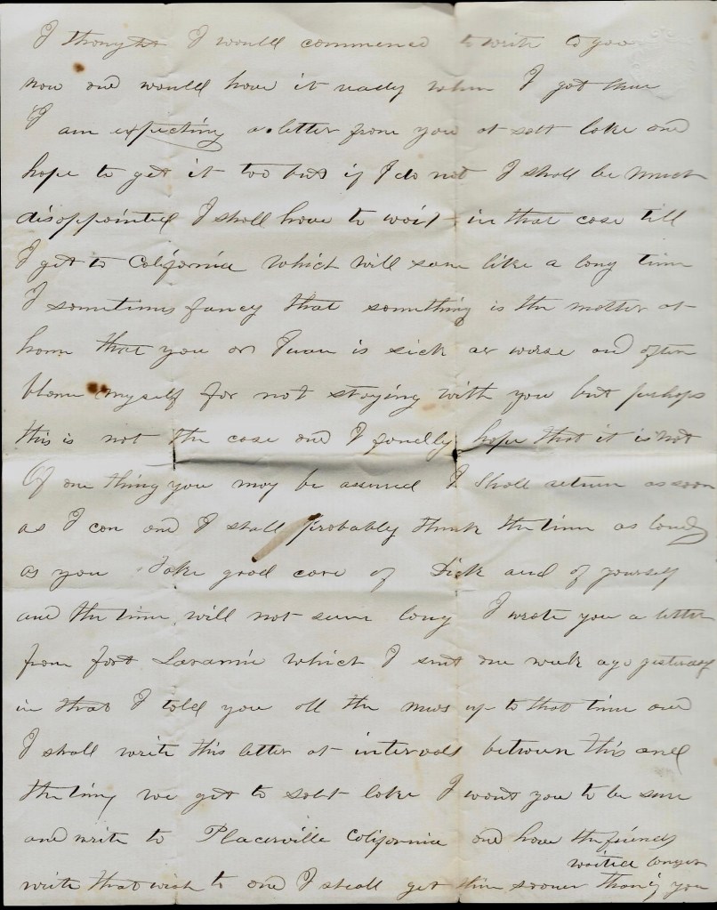 I sometimes fancy that something is the matter at home, that you or Juan is sick or worse and often blame myself for not staying with you but perhaps this is not the case and I fondly hope that it is not. Of one thing you may be assured, I shall return as soon as I can, and I shall probably think the time as long as you. Take good care of Dick and yourself and the time will not seem long. I wrote you a letter from Fort Laramie which I sent one week ago yesterday. In that I told you all the news up to that time and I shall write this letter at intervals between this and the time we get to Salt Lake. I want you to be sure and write to Placerville, California and have the friends write that wish to and I shall get there sooner than if you waited longer.