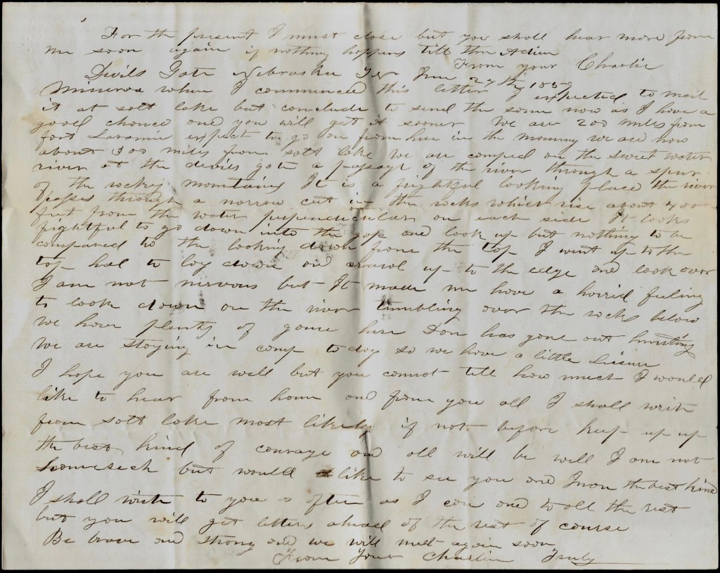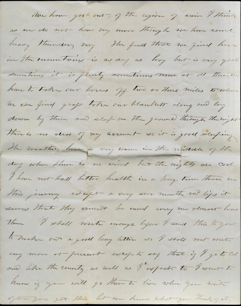 We have got out of the region of rain I think as we do not have any more though we have some heavy thunder very. The feed that we find here in the mountains is as dry as hay but is very good. Sometimes it is plenty, sometimes none at all. Then we have to take our horses off two or three miles to where we can find grass, take our blanket along and lay down by them and sleep on the ground through the night. There is no dew of any account, so it is good sleeping. The weather here is very warm in the middle of the day when there is no wind but the nights are cool. I have not had better health in a long time than on this journey except a very sore mouth and lips. It seems that they cannot be cured. Everyone almost has them. I shall write enough before I send this to you to make out a good long letter, so I shall not write any more at present except to say that if I go to California and like the country as well as I expect to, I want to know if you will go there to live. When you write after you get this, let me know what you think of it. For the present I must close but you will hear more from me soon again if nothing happens. Till then Adieu, From your Charlie