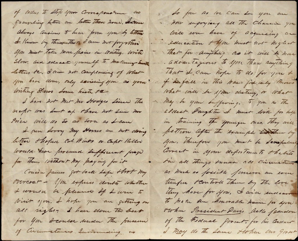 Cousin James got back safe & brought my overcoat. You express doubts whether I would be pleased if I were to visit you. I hope you are getting on all right. I have done the best for you I could under the pressure of circumstances surrounding us. So far as we can see, you are now enjoying all the chance you will ever have of acquiring an education & you must not neglect that for anything as it will be more advantageous to you than anything that I can hope to do for you. And if I fall in this war, God only knows what will be your destiny or what may be your suffering. To you—as the eldest daughter—I must look for help in training the younger ones. They will pattern after the example set them by you. Therefore you must be scrupulously correct in your deportments & habits & in all things & under all circumstances as much as possible preserve an even temper & control them by the love that have for you.