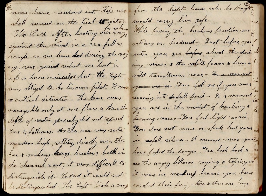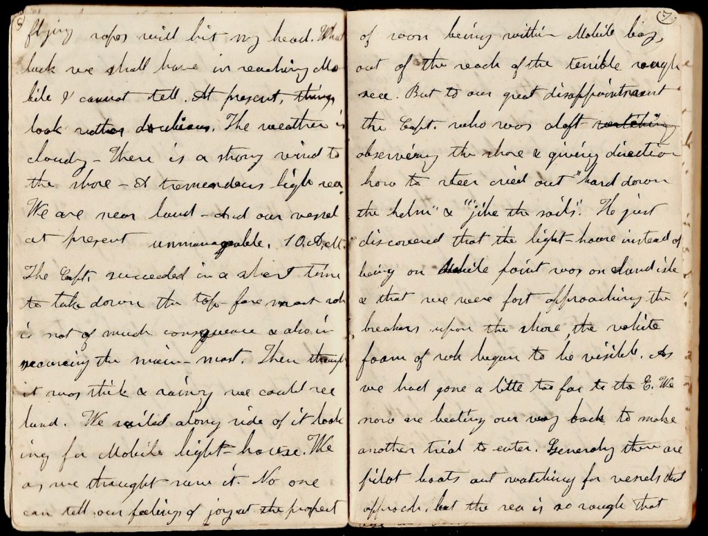 But to our great disappointment, the captain—who was aloft observing the shore & giving directions how to steer—cried out, “Hard down the helm!” and “Jibe the sails!” He just discovered that the lighthouse instead of being Mobile Point was on Sand Isle and that we were fast approaching the breakers upon the shore. The white foam of rock began to be visible. As he had gone a little too far to the east, we now are beating our way back to make another trial to enter. Generally there are pilot boats out watching for vessels that approach but the sea is so rough that none have ventured out. Hope we shall succeed on this trial to enter. 3:30 p.m. After beating our way for 10 hours against the wind in a sea full as rough as we have had during the voyage, we gained what we lost in a few more minutes, but the captain was obliged to be his own pilot. It was a critical situation. The bar was navigable only at one place and there the depth of water generally did not exceed 3 or 4 fathoms. As the sea was so tremendous high, setting directly over the bar and aking huge breakers both in the channel and out, it was difficult to distinguish it. Indeed, it could not be distinguished. The captain took a range from the lighthouse which he thought would carry him safe. While passing the breakers, peculiar sensations are produced. Just before you enter, you see ahead the dashing waves and the white foam & hear a wild tumultuous roar. You feel as if you were running into awful [ ]. In a moment you are in the midst of breaking & foaming waves. You feel light as air. You dare not move or speak but gaze in awful silence. A moment more and you have passed the danger. You look back and see the angry billows raging and tossing as it were in [ ] because you have escaped their fury. Now and then one huge wave, more furious than the rest, dashes after you threatening to overtake and destroy you but fails. you can hardly believe that you are safe after the danger is over. I now bid farewell to old ocean. The [sea] treated me rather roughly. I think I shall not make acquaintance with her again. We now are in Mobile Bay, have smooth water [and] are abut 20 miles from the city.