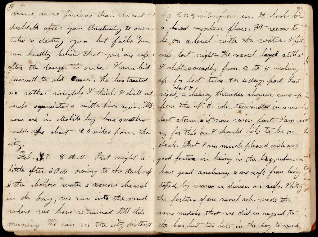 February 7th. 8 a.m. Last night a little after 6 p.m. owing to the darkness & the shallow water and narrow channel in the bay, we run into the mud where we have remained till this morning. We can see the city distinctly 2 or 3 miles from us. It looks like a low, sunken place. It seems to be on a level with the water. I felt safe last night. The vessel laid still & I slept soundly from 8 to 8 making up for lost time 3 or 4 days past. Last night about 7 a heavy thunder shower came up from the N. E. which terminated in a violent storm. It now rains fast. I am sorry for this as I should like to be on deck but I am much pleased with our good fortune in being in the bay where we have good anchorage & are safe from being tossed by waves or driven on reefs. I pity the fortunes of one vessel which made the mistake that we did in regard to the bar but too late in the day to mend her mistake. She anchored but high sea and the storm last night I fear has driven her from her anchorage. It happened lucky that we made the mistake in the early part of the day. In fact during the whole voyage we have been fortunate—been highly favored by Providence. When we started from Boston, we had a good breeze to carry us around Cape Cod & afterwards strong northerly winds. When we came near running upon the coast of Abaco, we were fortunate in discovering the lighthouse in season to [ ]. When we approached Florida reefs, the captain, by constantly throwing the lead, discovered that we were approaching them & cast anchor before we were in danger. Then when we were aground at Key West, there was scarcely no breeze & it was low water so that in a short time we were off. And last & most fortunate of all when there was a tremendous high sea so that no pilot ventured out, & just before a heavy storm driving towards shore without the guidance of a pilot, we succeeded in safely passing the bar where we now feel secure. Never before did I realize so much the import of the vessels safety, security and the like.