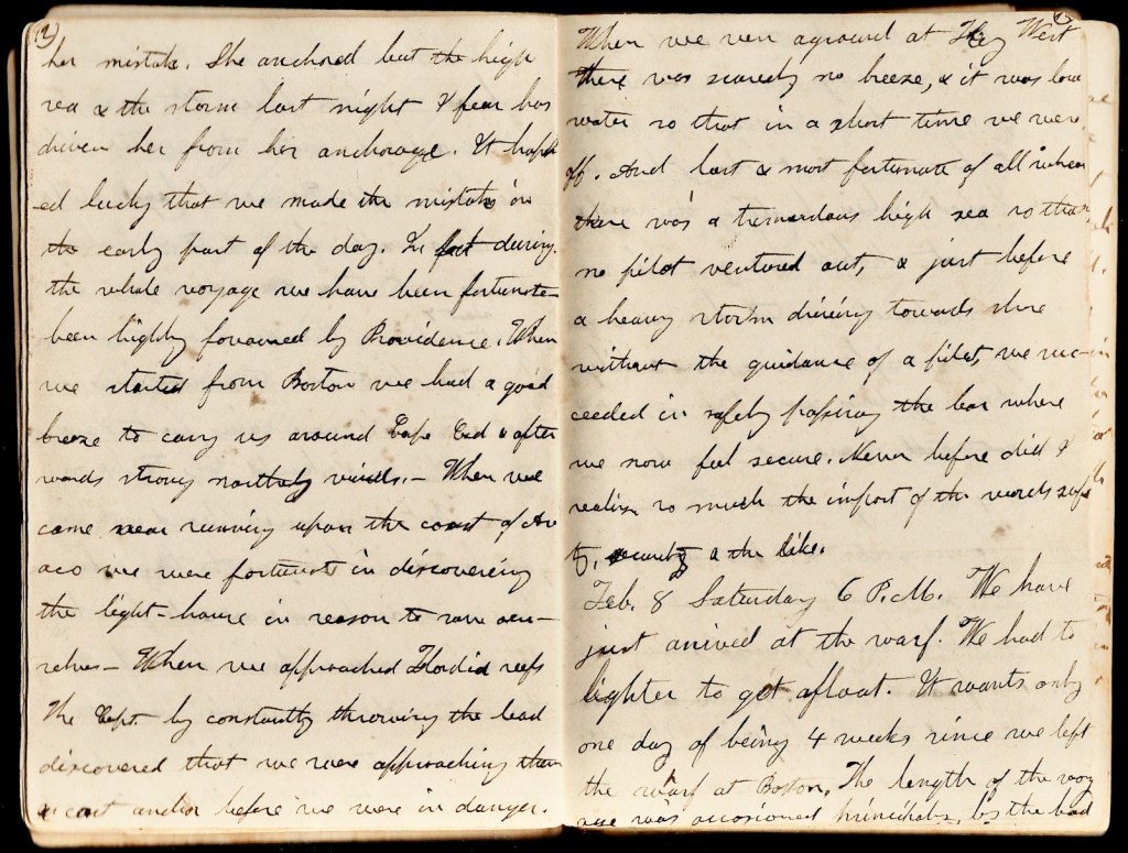 February 8th. Saturday, 6 p.m. We have just arrived at the wharf. We had to lighter to get afloat. It wants only a day of being 4 weeks since we left the wharf at Boston. The length of the voyage was occasioned principally by the bad weather. Several other vessels which started some days sooner were still longer on their passage. We have just learned that the schooner which we passed when beating the wind & waves at Mobile Bay and which we saw anchored parted her cable during the night and went ashore. Whether any lives were lost or not I have not heard.