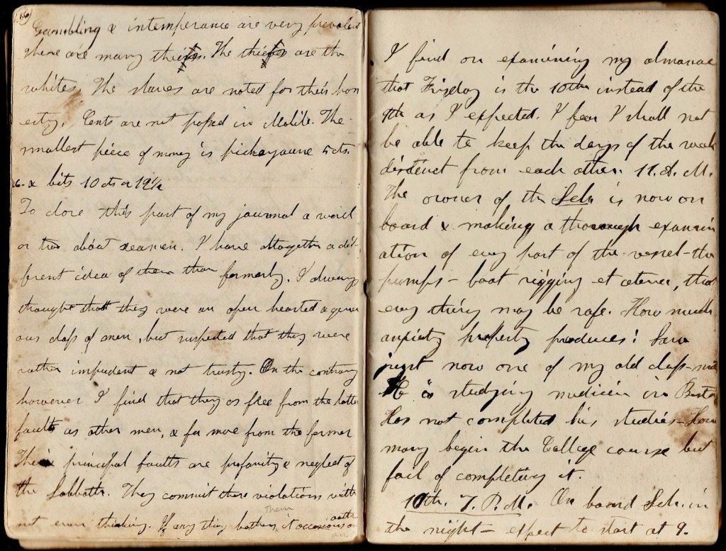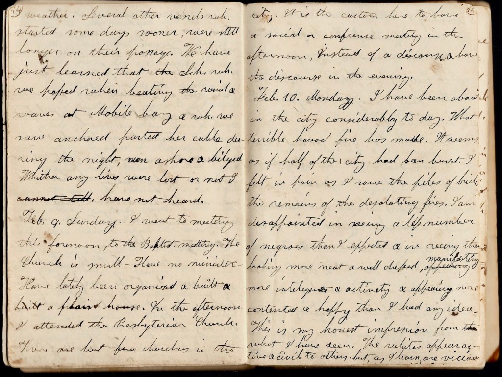 February 10th. Monday. I have been about in the city considerable today. What terrible havoc fires has made. It seems as if half of the city had been burnt. I felt in pain as I saw the piles of brick—the remains of the desolating fires. I am disappointed in seeing a less number of negroes than I expected & in seeing them looking more neat & well dressed, manifesting more intelligence & activity & appearing more contented & happy that I had any idea. This is my honest impression from what I have seen. The whites appear active & civil to others but, as I learn, are villainous. Gambling & intemperance are very prevalent. There are many thieves. The thieves are the whites. The slaves are noted for their honesty. Cents are not passed in Mobile. The smallest piece of money is picayune 5 cents & bits (10 cents or 12.5). To close this part of my journal, a word or two about seamen. I have altogether a different idea of them than formerly. I always thought that they were an open-hearted & generous class of men, but suspected that they were rather rather impudent & not trusty. On the contrary, however, I find that they are as free from the latter fault as other men & more from the former. The principal fault are profanity & neglect of the Sabbath. They commit these violations without thinking. If anything bothers them, it occasions an oath.